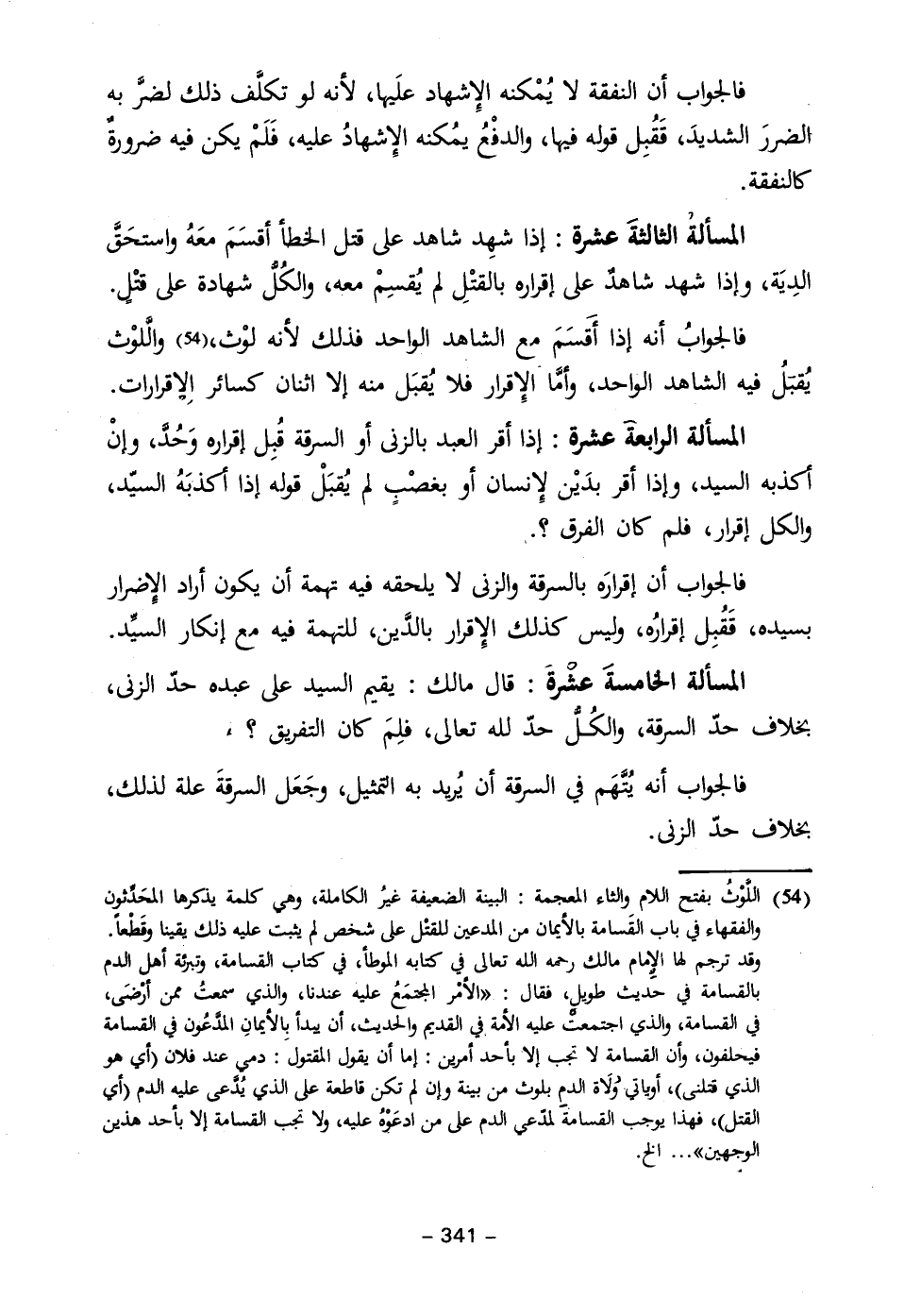 فالجوابُ أنه إذا أَقسَمَ مع الشاهد الواحد فذلك لأنه لوْث، (٥٤) واللوْث يُقبَلُ فيه الشاهد الواحد، وأمَّا الإِقرار فلا يُقبَل منه إلا اثنان كسائر الإِقرارات.