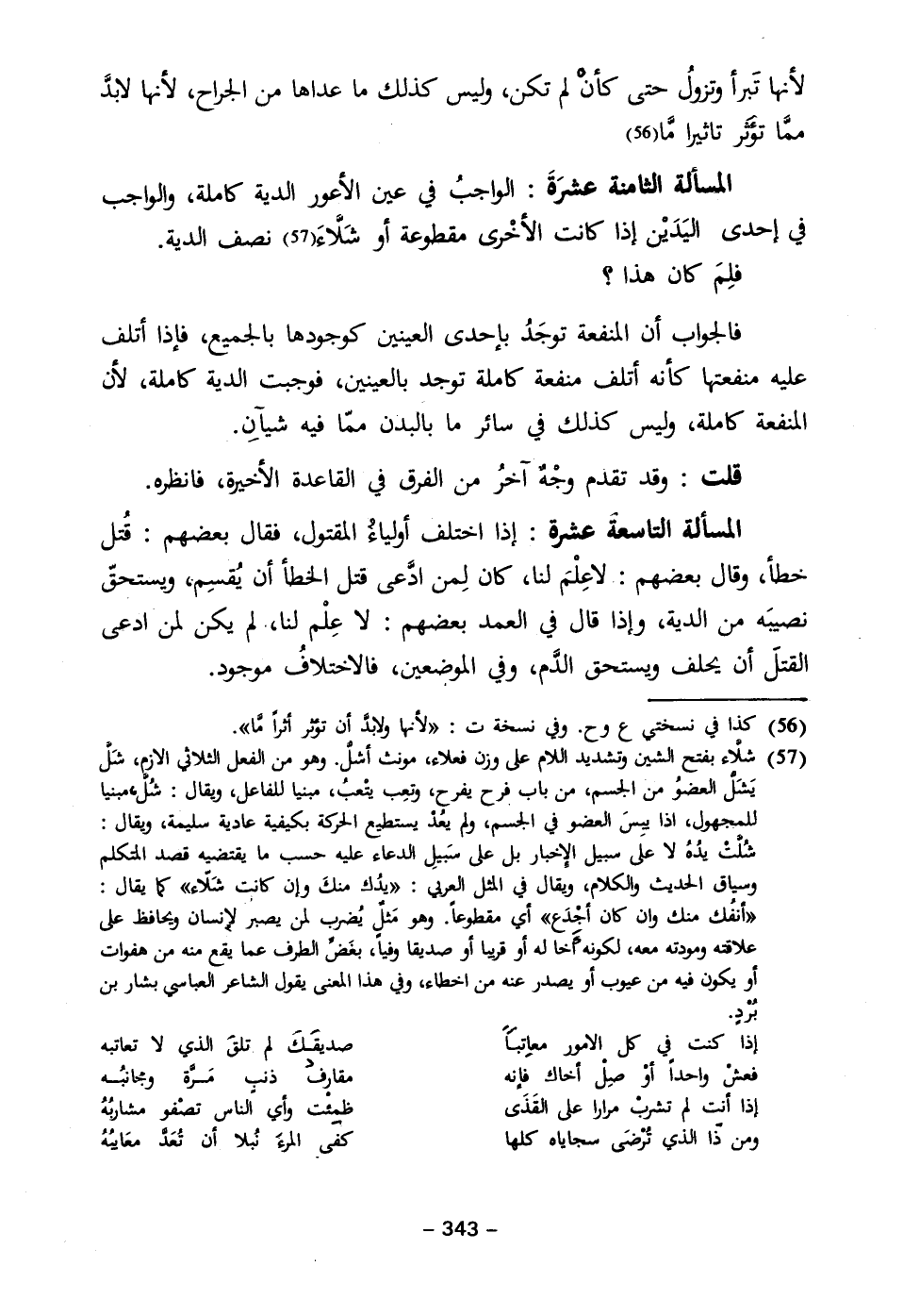 المسألة الثامنة عشرَةَ: الواجبُ في عين الأعور الدية كاملة، والواجب في إحدى اليَدَيْن إذا كانت الأخْرى مقطوعة أو شَلَّاءَ (٥٧) نصف الدية.