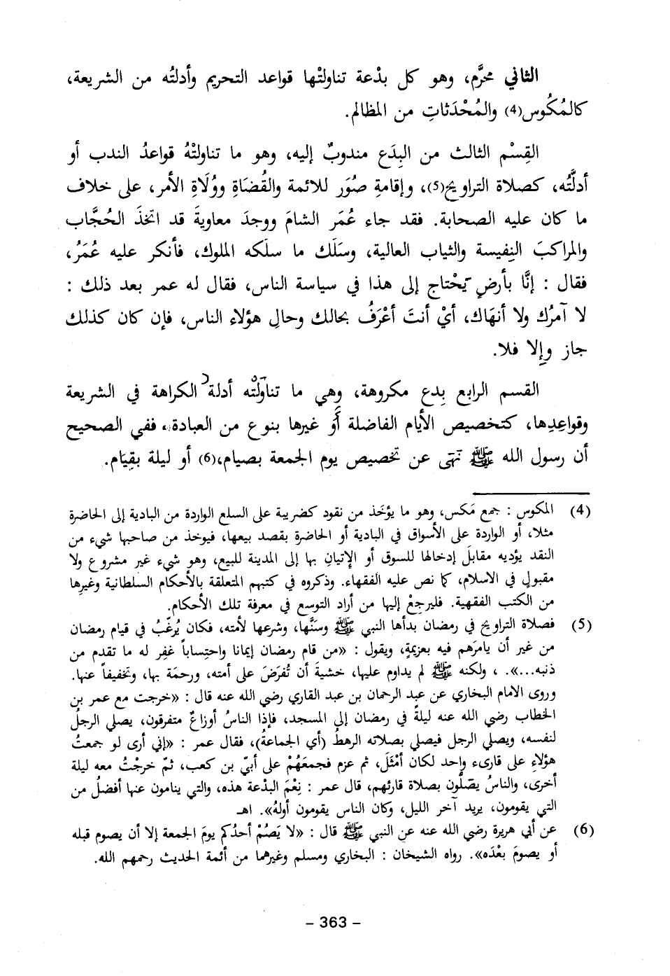 القسم الرابع بِدع مكروهة، وهي ما تناولته أدلة الكراهة في الشريعة وقواعِدِها، كتخصيص الأيام الفاضلة أَو غيرها بنوع من العبادة، ففي الصحيح أن رسول الله - صلى الله عليه وسلم - نهى عن تخصيص يوم الجمعة بصيام، (٦) أو ليلة بقِيَام.