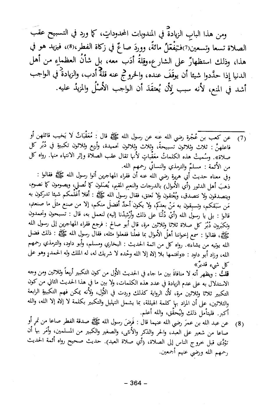 ومن هذا البابِ الزيادة في المندوبات المحدودات، كما ورد في التسبيح عقب الصلاة تسعا وتسعين (٧) فيفعل مائةً، ووردَ صاعٌ في زكاة الفطر، (٨)، فيزيد هو في هذا، وذلك استظهارٌ على الشارع، وقلةُ أدَب معه، بل شأنُ العظماءِ من أهل الدنيا إذا حدَّدوا شيئا أن يوقَفَ عنده، والخروج عنه قلة أدب، والزيادة في الواجب أشد في المنع، لأنه سبب لأن يُعتقَدَ أن الواجب الأصْلُ والمزيدُ عليه.