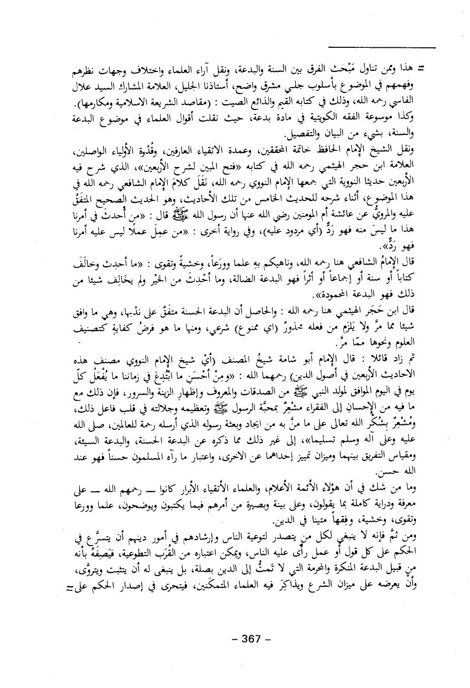 ونقل الشيخ الإِمام الحافظ خاتمة المحققين، وعمدة الأتقياء العارفين، وقُدْوة الأولياء الواصلين، العلامة ابن حجر الهيثمي رحمه الله في كتابه "فتح المبين لشرح الأربعين"، الذي شرح فيه الأربعين حديثا النووية التي جمعها الإِمام النووي رحمه الله، نَقَلَ كلامَ الإِمام الشافعي رحمه الله في هذا الموضوع، أثناء شرحه للحديث الخامس من تلك الأحاديث، وهو الحديث الصحِيح المتفَقُ عليه والمروىُّ عن عائشة أم المؤمنين رضي الله عنها أن رسول الله - صلى الله عليه وسلم - قال: "منِ أحدث في أمرنا هذا ما ليسَ منه فهو رَدٌ (أي مردود عليه)، وفي رواية أخرى: "من عمِلَ عملَا ليس عليه أمرنا فهو رَدٌّ".