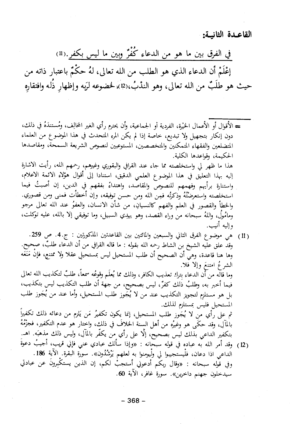 (١١) هي موضوع الفرق الثاني والسبعين والمائتين بين القاعدتين المذكورتين: جـ ٤. ص ٢٥٩. وقد علق عليه الشيخ بن الشاط رحمه الله بقوله: ما قاله القرافي من أن الدعاء طلبٌ، صحيح. وها هنا قاعدة، وهي أن الصحيح أن طلب المستحيل ليس بمستحيل عقلا ولا ممتنع، فإن مَنَعَه الشرعُ امتنع وإلا فلا.