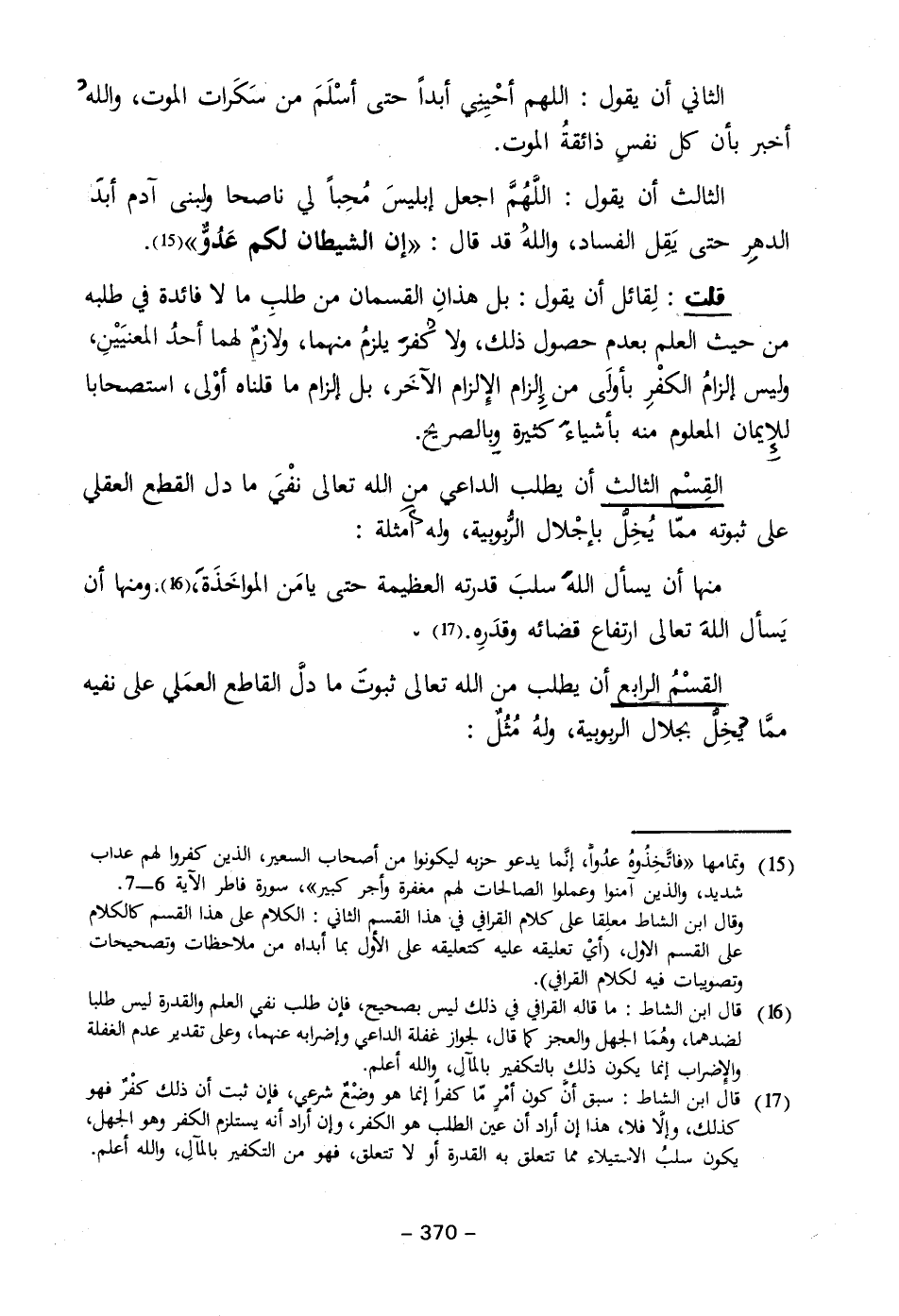 (١٦) قال ابن الشاط: ما قاله القرافي في ذلك ليس بصحيح، فإن طلب نفى العلم والقدرة ليس طلبا لضدهما، وهُمَا الجهل والعجز كما قال، لجواز غفلة الداعي وإضرابه عنهما، وعلى تقدير عدم الغفلة والإضراب إنما يكون ذلك بالتكفير بالمآلِ، والله أعلم.
