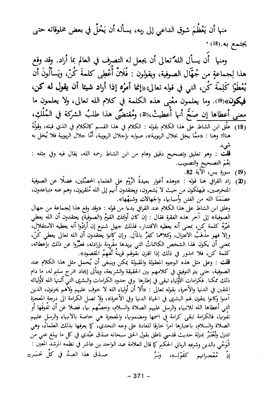 ومنها أَن يسأل اللهَ تعالى أن يجعل له التصرف في العالم بما أراد. وقد وقع هذا لِجماعةٍ من جُهَّال الصوفية، ويقولون: فُلَانٌ أعْطِى كلمةَ كُنْ، ويَسألونَ أن يُعْطَوْا كَلِمة كُن، التي في قوله تعالى: {إِنَّمَا أَمْرُهُ إِذَا أَرَادَ شَيْئًا أَنْ يَقُولَ لَهُ كُنْ فَيَكُونُ} (١٩). وما يعلمون معْنى هذه الكلمة في كلام الله تعالى، ولا يعلمون ما معنى أعطاها إن صَحّ أنها أعطيتْ، (٢٠) ومُقتضى هذا طلبُ الشركة في المُلْكِ،