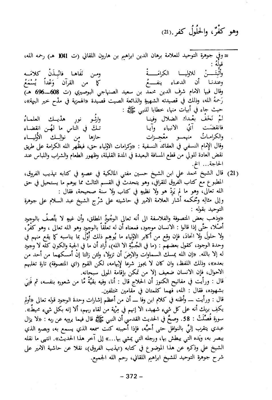 = وفى جوهرة التوحيد للعلامة برهان الدين إبراهيم بن هارون اللقاني (ت ١٠٤١ هـ) رحمه الله، قولهُ: