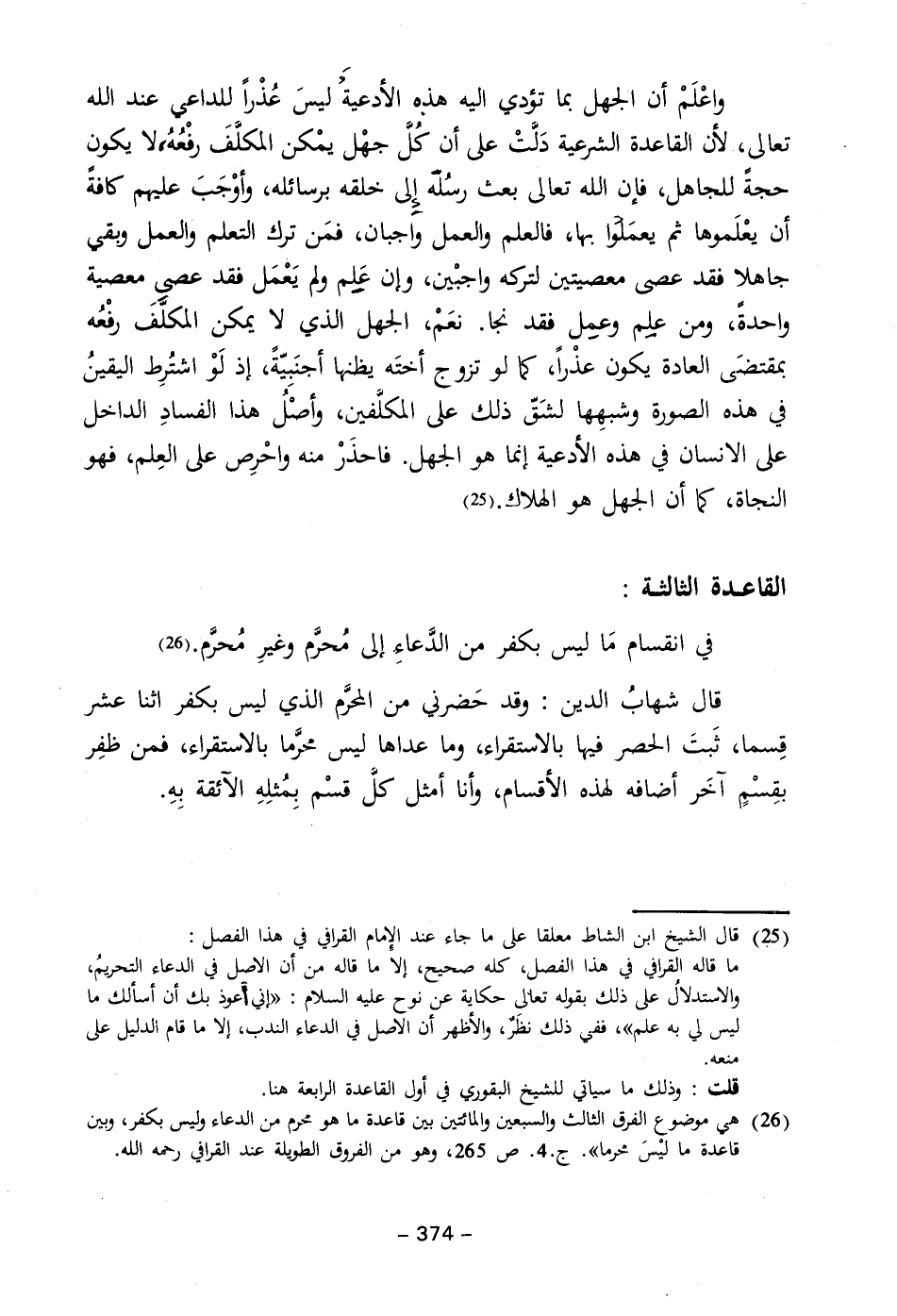 (٢٦) هي موضوع الفرق الثالث والسبعين والمائتين بين قاعدة ما هو محرم من الدعاء وليس بكفر، وبين قاعدة ما ليْسَ محرما". جـ ٤. ص ٢٦٥، وهو من الفروق الطويلة عند القرافي رحمه الله.