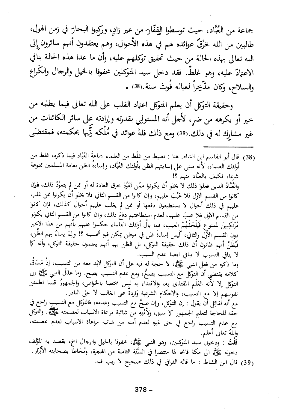(٣٨) قال أبو القاسم ابن الشاط هنا: تغليط من غلَّطَ من العلماء. جماعةَ العُبَّاد فيما ذكره، غلط من أولئك العلماء، لأنه مبني على إساءتهم الظن بأولئك العُبَّاد، وإساءةُ الظن بعامة المسلمين ممنوعة شرعا، فكيف بالعبَّاد منهم؟ !