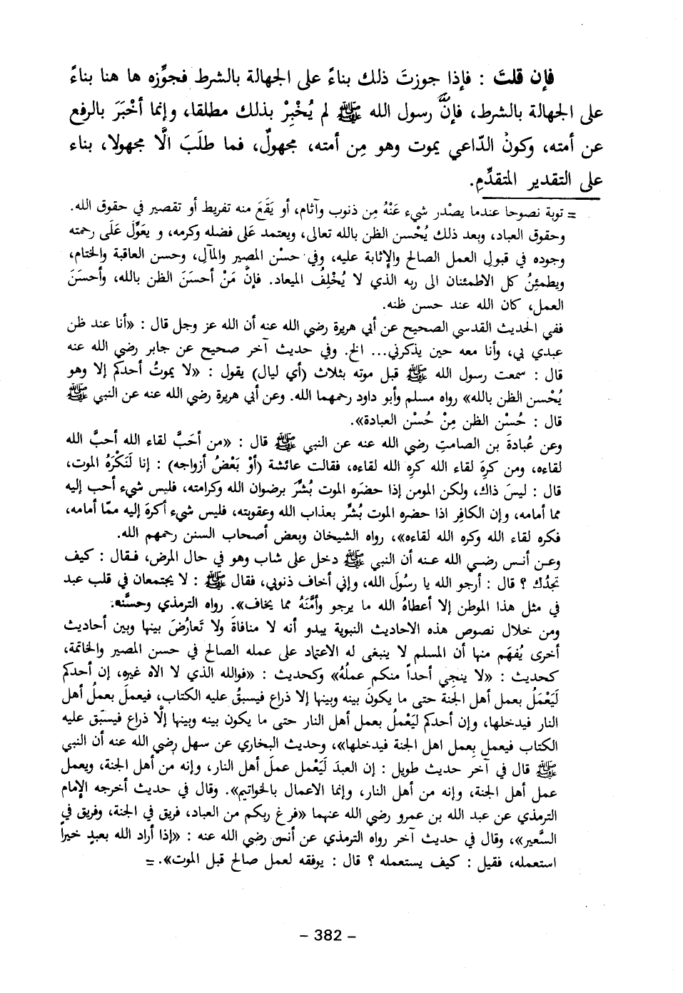 ومن خلال نصوص هذه الأحاديث النبوية يبدو أنه لا منافاةَ ولا تَعارُضَ بينها وبين أحاديث أخرى يُفهَم منها أن المسلم لا ينبغي له الاعتماد على عمله الصالح في حسن المصير والخاتمة، كحديث: "لا ينجِي أحداً منكمِ عملُهُ" كحديث: "فوالله الذي لا إلاه غيره، إن أحدكم لَيَعْمَلُ بعمل أهل الجَنة حتى ما يكون بينه وبينها إلا ذراع فيسبقُ عليه الكتاب، فيعملَ بعمل أهل النار فيدخلها، وإن أحدكم ليَعْملُ بعمل أهل النار حتى ما يكون بينه وبينها إلا ذراع فيسبق عليه الكتاب فيعمل بِعمل أهل الجنة فيدخلها"، وحديث البخاري عن سهل رضي الله عنه أن النبي - صلى الله عليه وسلم - قال في آخر حديث طويل: إن العبدَ لَيَعْمل عملَ أهل النار، وإنه من أهل الجنة، ويعمل عمل أهل الجنة، وإنه من أهل النار، وإنما الأعمال بالخواتيم". وقال في حديث أخرجه الإِمام الترمذي عن عبد الله بن عمرو رضي الله عنهما "فرغ ربكم من العباد، فريق في الجنة، وفريق في السَّعير"، وقال في حديث آخر رواه الترمذي عن أنس رضي الله عنه: "إذا أراد الله بعبدٍ خيراً استعمله، فقيل: كيف يستعمله؟ قال: يوفقه لعمل صالح قبل الموت". =