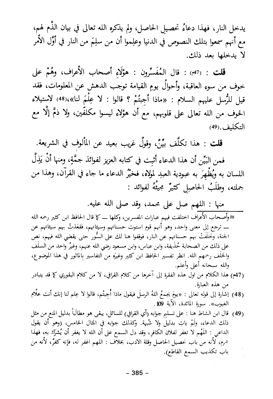 (٤٩) قال ابن الشاط هنا: على تسليم جوابه (أي القرافي) للسائل، يبقى هو مطالَباً بدليل المنع من مثل ذلك الدعاء، ولَمْ يأتِ بدليل ولا شُبهة. وكذلك جوابه في المثال الخامس، (وهو أن يقول الداعى: اللَهُم لا تغفر لفلان الكافرِ، وقد دل السمع على أن الله لا يغفر أن يُشرَك به، فهذا محرم، لأنه من باب تحصيل الحاصل وقلة الأدب، بخلاف: اللهم اغفر له، فإنه كفرٌ، لأنه من باب تكذيب السمع القاطع).