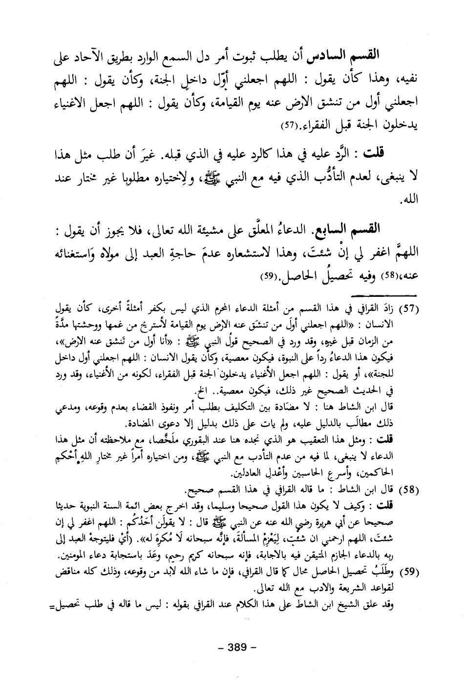 القسم السابع. الدعاءُ المعلَّق على مشيئة الله تعالى، فلا يجوز أن يقول: اللهمَّ اغفر لي إنْ شئتَ، وهذا لاستشعاره عدمَ حاجةِ العبد إلى مولاه وَاستغنائه عنه، (٥٨) وفيه تحصيلُ الحاصل. (٥٩)