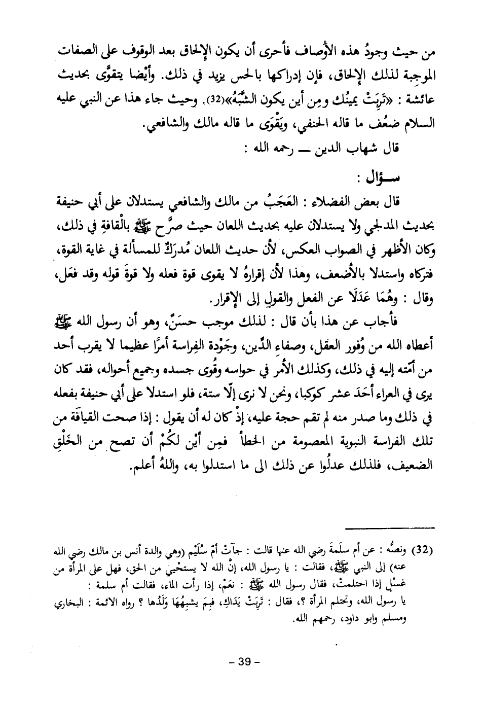 (٣٢) ونصُّه: عن أم سلَمةَ رضي الله عنها قالت: جآتْ أمّ سُلَيْم (وهي والدة أنس بن مالك رضي الله عنه) إلى النبي - صلى الله عليه وسلم -، فقالت: يا رسول الله، إنَّ الله لا يستحْيي من الحق، فهل على المرأة من غسْلٍ إذا احتلمتْ، فقال رسول الله - صلى الله عليه وسلم -: نعَمْ، إذا رأت الماء، فقالت أم سلمة: