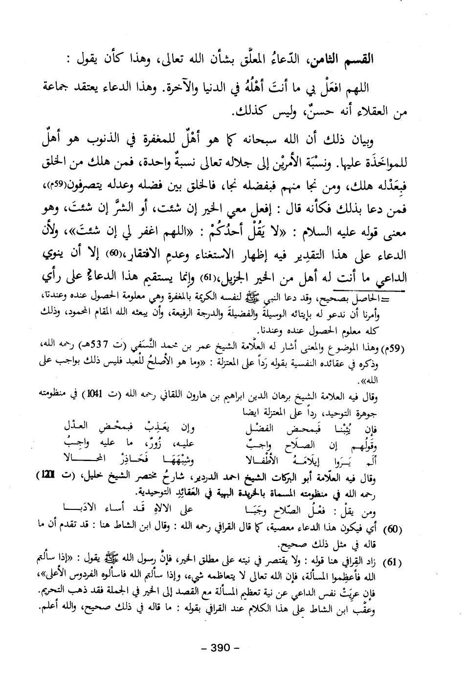 (٦٠) أي فيكون هذا الدعاء معصية، كما قال القرافي رحمه الله: وقال ابن الشاط هنا: قد تقدم أن ما قاله في مثل ذلك صحيح.