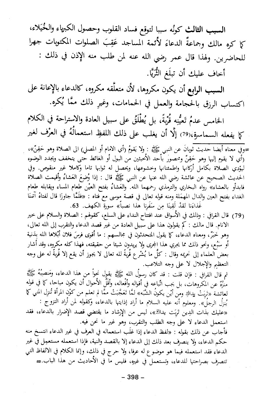 السبب الثالث كونُه سببا لتوقع فساد القلوب وحصول الكبرباء والخُيَلاء، كما كره مالك وجماعةٌ الدعاءَ لأئمة المساجد عَقِبَ الصلوات المكتوبات جهرا للحاضرين. ولهذا قال عمر رضي الله عنه لمن طلب منه الإِذن في ذلك: