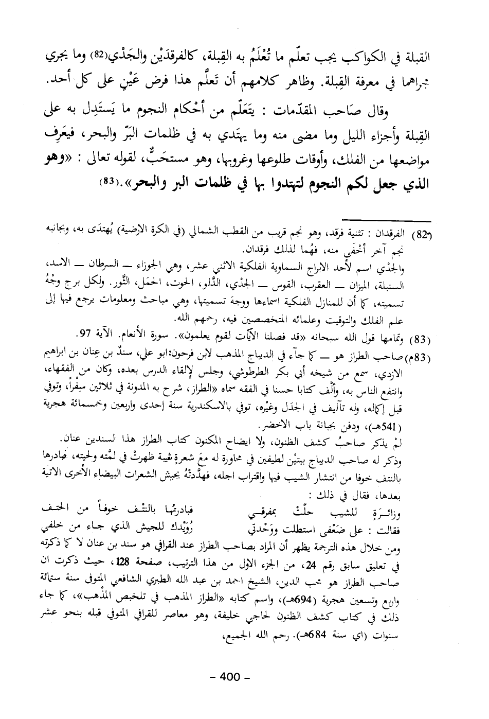 وقال صَاحب المقدّمات: يتَعَلّم من أحْكام النجوم ما يَستَدِل به على القِبلة وأجزاء الليل وما مضى منه وما يهتَدي به في ظلمات البَرّ والبحر، فيعَرِف مواضعها من الفلك، وأوقات طلوعها وغروبها، وهو مستحَبٌّ، لقوله تعالى: {وَهُوَ الَّذِي جَعَلَ لَكُمُ النُّجُومَ لِتَهْتَدُوا بِهَا فِي ظُلُمَاتِ الْبَرِّ وَالْبَحْرِ}. (٨٣)