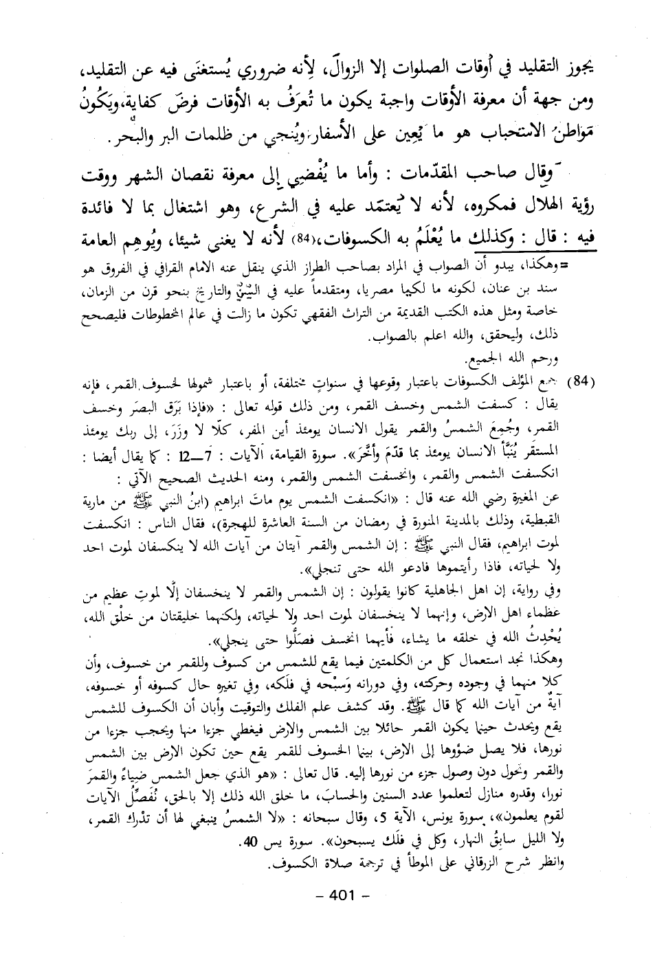 وقال صاحب المقدّمات: وأما ما يُفْضي إِلى معرفة نقصان الشهر ووقت رؤية الهلال فمكروه، لأنه لا يعتمَد عليه في الشرع، وهو اشتغال بما لا فائدة فيه: قال: وكذلك ما يُعْلَمُ به الكسوفات، (٨٤) لأنه لا يغني شيئا، ويُوهِم العامة