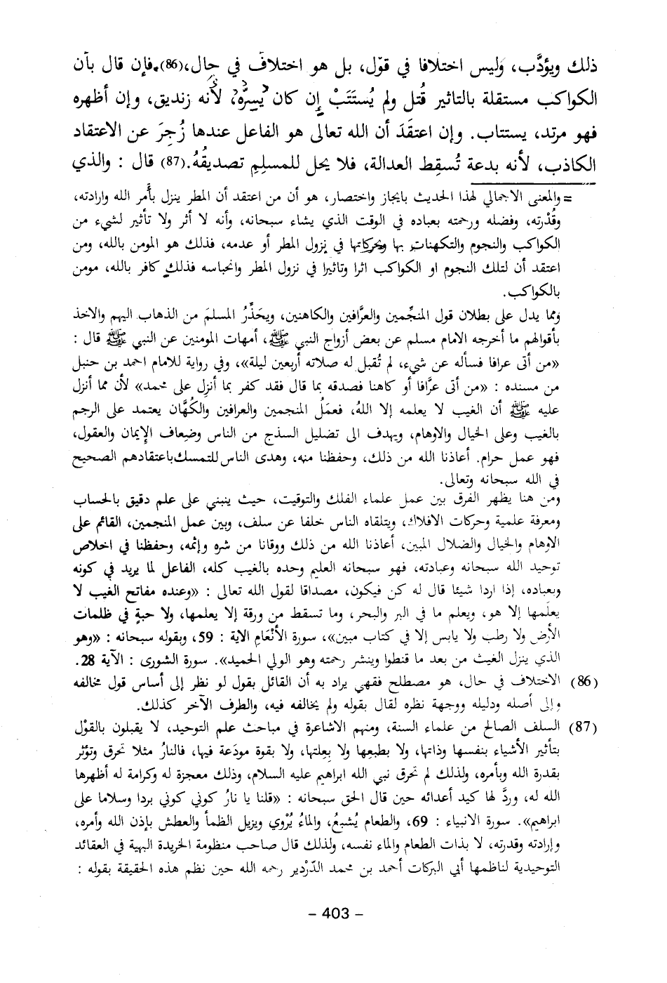 ذلك ويؤدَّب، وليس اختلافا في قول، بل هو اختلاف في حال، (٨٦). فإن قال بأن الكواكب مستقلة بالتاثير قُتل ولم يُستَتَبْ إن كان يسِره لأنه زنديق، وإن أظهره فهو مرتد، يستتاب. وإن اعتقَدَ أن الله تعالى هو الفاعل عندها زُجرَ عن الاعتقاد الكاذب، لأنه بدعة تُسقِط العدالة، فلا يحل للمسلِمِ تصديقُهُ. (٨٧) قال: والذي