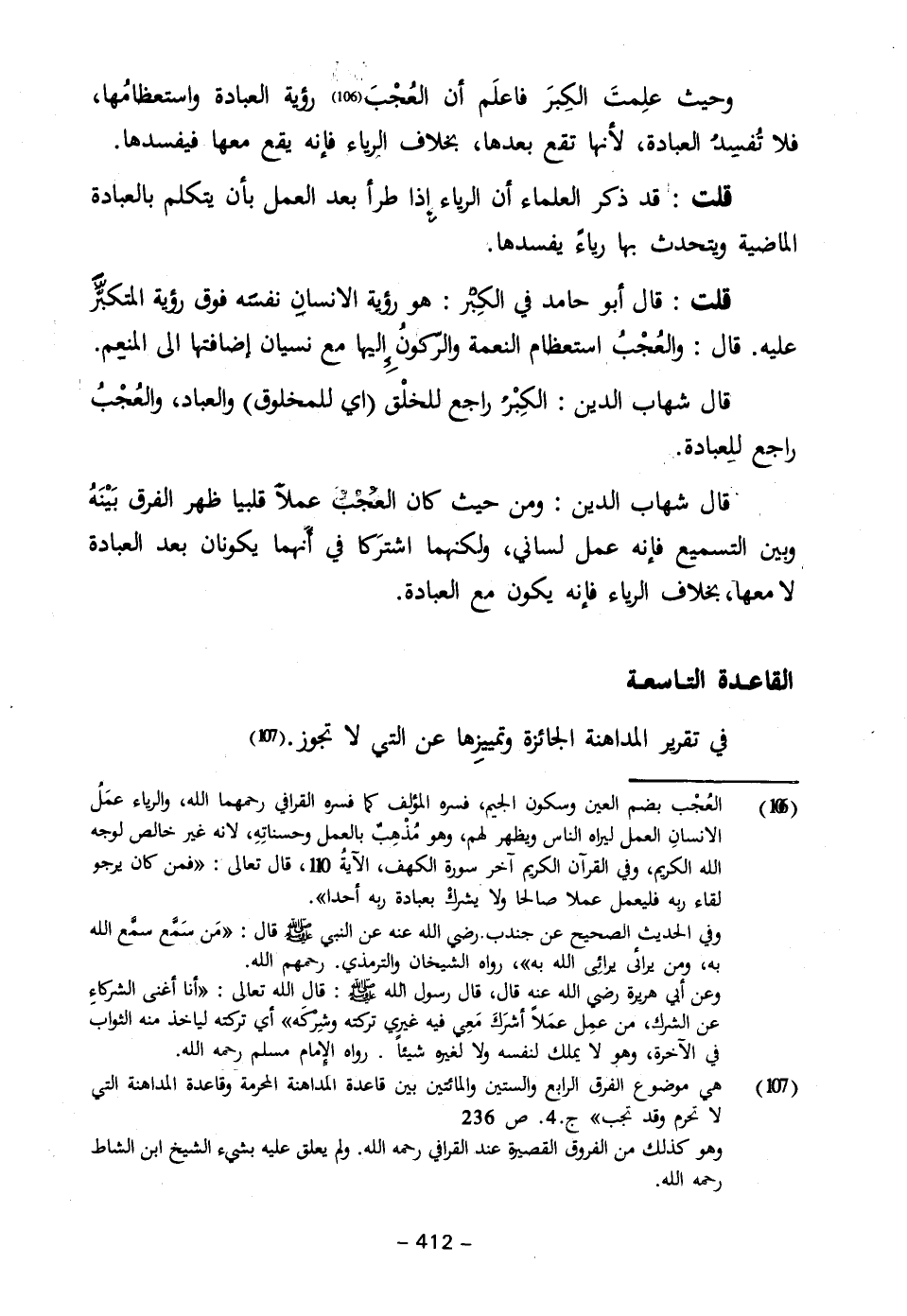 (١٠٦) العُجْب بضم العين وسكون الجيم، فسره المؤلف كما فسره القرافي رحمهما الله، والرياء عمَلُ الانسانِ العمل ليراه الناس ويظهر لهم، وهو مُذْهِب بالعمل وحسناتِهِ، لانه غير خالص لوجه الله الكريم، وفي القرآن الكريم آخر سورة الكهف، الآيةُ ١١٠، قال تعالى: {فَمَنْ كَانَ يَرْجُو لِقَاءَ رَبِّهِ فَلْيَعْمَلْ عَمَلًا صَالِحًا وَلَا يُشْرِكْ بِعِبَادَةِ رَبِّهِ أَحَدًا}.