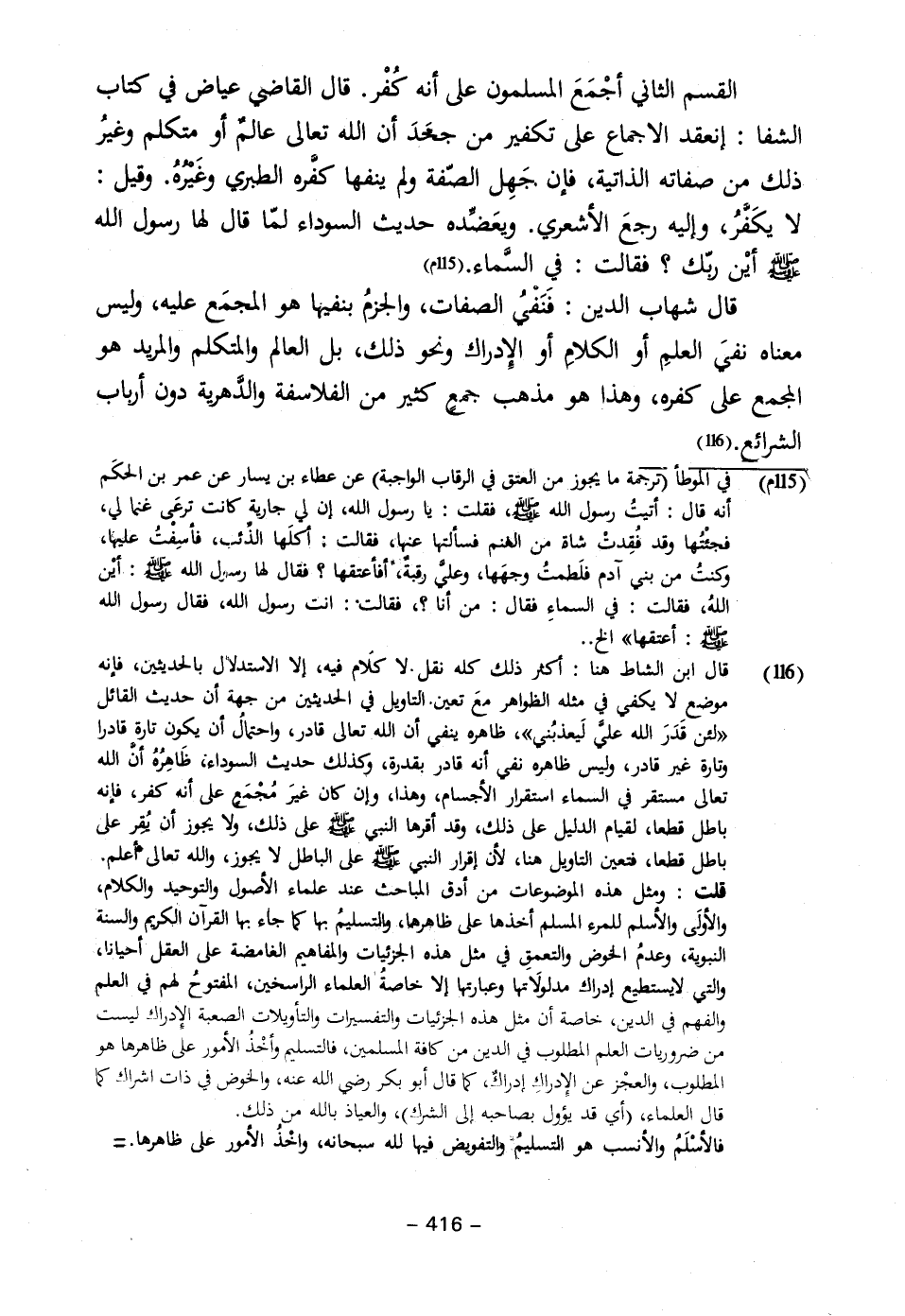 (١١٦) قال ابن الشاط هنا: أكثر ذلك كله نقل. لا كلَام فيه، الا الاستدلال بالحديثين، فإنه موضع لا يكفي في مثله الظواهر تعين التاويل في الحديثين من جههّ أن حديث القائل "لئن قدَرَ الله عليَّ لَيعذبُني"، ظاهره ينفي أن الله تعالى قادر، واحتمالُ أن يكون تارة قادرا وتارة غير قادر، وليس ظاهره نفى أنه قادر بقدرة، وكذلك حديث السوداء، ظَاهِرُهُ أن الله تعالى مستقر في السماء استقرار الأجسام، وهذا، وإن كان غيرَ مُجْمع على أنه كفر، فإنه باطل قطعا، لقيام الدليل على ذلك، وقد أقرها النبي - صلى الله عليه وسلم - على ذلك، ولا يجوز أن يقر على باطل قطعا، فعين التاويل هنا، لأن إقرار النبي - صلى الله عليه وسلم - على الباطل لا يجوز، والله تعالى اعلم قلت: ومثل هذه الموضوعات من أدق المباحث عند علماء الأصول والتوحيد والكلام، والأولى والأسلم للمرء المسلم أخذها على ظاهرها، والتسليمُ بها كما جاء بها القرآن الكريم والسنة النبوية، وعدمُ الحوض والتعمقِ في مثل هذه الجزئيات والمفاهيم الغامضة على الحقل أحيانا، والتي لا يستطيع إدراك مدلولَاتها وعبارتها الا خاصةُ العلماء الراسخين، المفتوحُ لهم في العلم والفهم في الدين، خاصة أن مثل هذه الجزئيات والتفسيرات والتأويلات الصعبة الإدراك ليست من ضروريات العلم المطلوب في الدين عن كافة المسلمين، فالتسليم وأخْذُ الأمور على ظاهرها هو المطلوب، والعجْز عن الِإدراك إدراكٌ، كما قال أبو بكر رضي الله عنه، والخوض في ذات اشراك كما قال العلماء، (أي قد يؤول بصاحبه إلى الشرك)، والعياذ بالله من ذلك.
