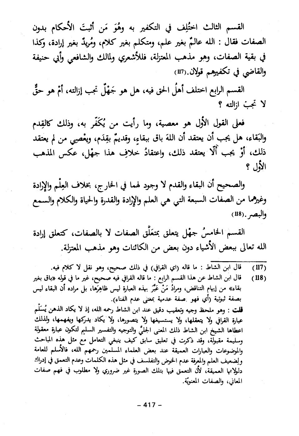 (١١٨) قال ابن الشاط عن هذا القسم الرابع: ما قاله القرافي فيه صحيح، غير ما في قوله "باق بغير بقاء" من (إيهام التناقض، ومرادُ مَن عَبر بهذه العبارة ليس ظاهِرَها، بل مراده أن البقاء ليس بصفة ثبوتية (أي فهو صفة عدمية بمعنى عدم الفناء).