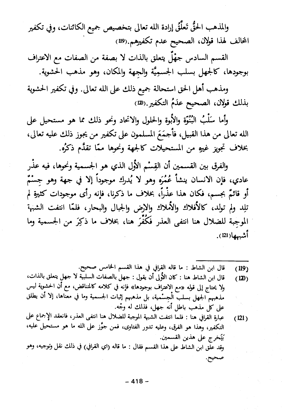 (١٢١) عبارة القرافي هنا: فلما انتفت الشبهة الموجبة للضلال هنا انتفى الحذر، فانعقد الإجماع على التكفير، وهذا هو الفرق، وعليه تدور الفتاوى، فمن جوَّز على الله ما هو مستحيل عليه، بَتخرج على هذين القسمين.