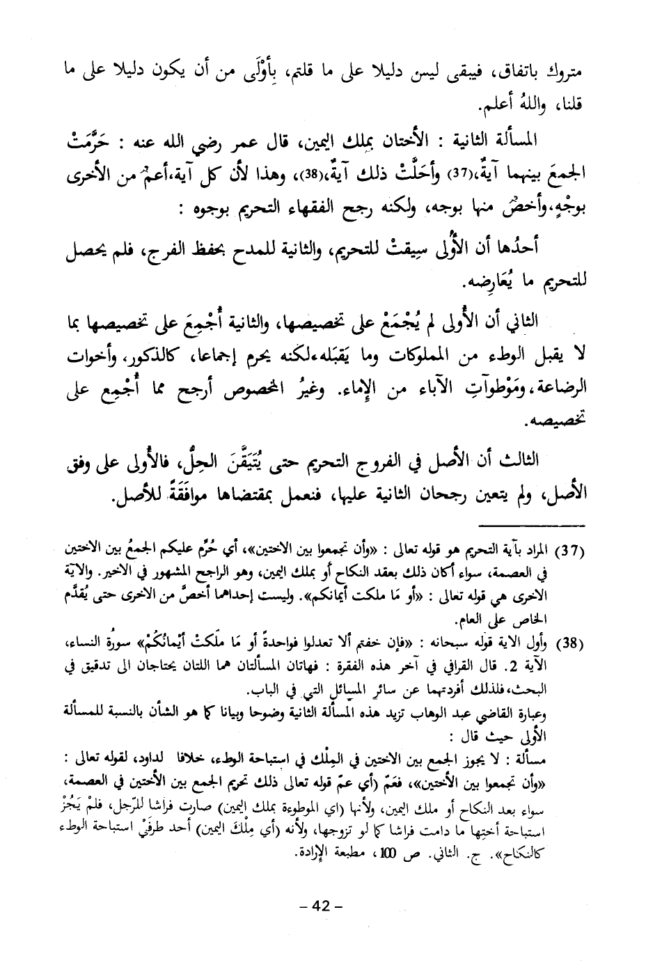 (٣٨) وأول الآية قوله سبحانه: {فَإِنْ خِفْتُمْ أَلَّا تَعْدِلُوا فَوَاحِدَةً أَوْ مَا مَلَكَتْ أَيْمَانُكُمْ} سورُة النساء، الآية ٢. قال القرافي في آخر هذه الفقرة: فهاتان المسألتان هما اللتان يحتاجان إلى تدقيق في البحث، فلذلك أفردتهما عن سائر المسائل التي في الباب.