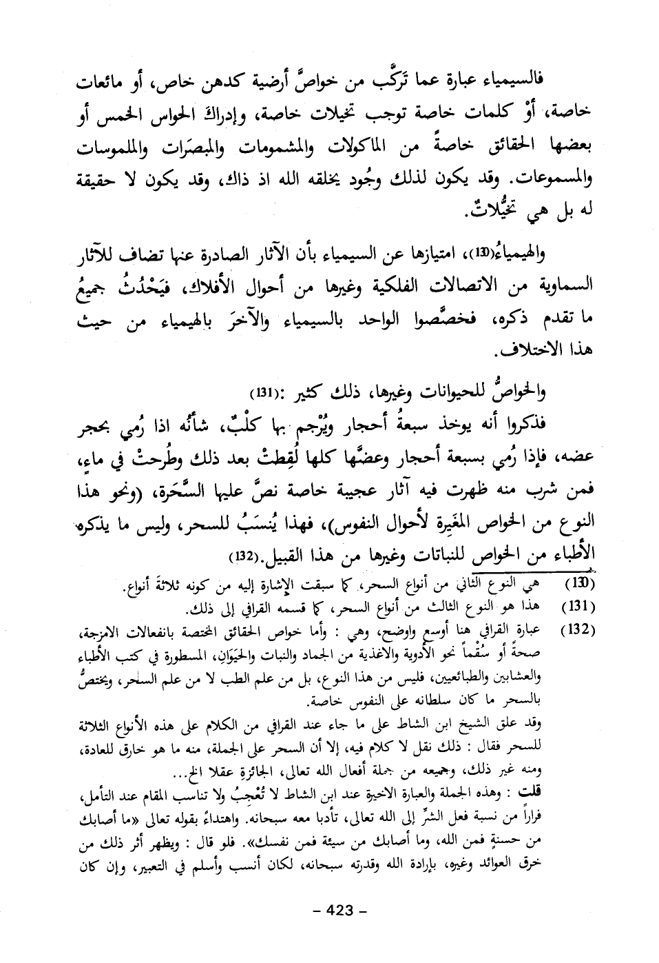 (١٣٢) عبارة القرافي هنا أوسع واوضح، وهي: وأما خواص الحقائق المختصة بانفعالات الامزجة، صحةً أو سُقْماً نحو الأدوية والأغذية من الجماد والنبات والحيَوَانِ، المسطورة في كتب الأطباء والعشابين والطبائعيين، فليس من هذا النوع، بل من علم الطب لا من علم السحر، ويختصُّ بالسحر ما كان سلطانه على النفوس خاصة.