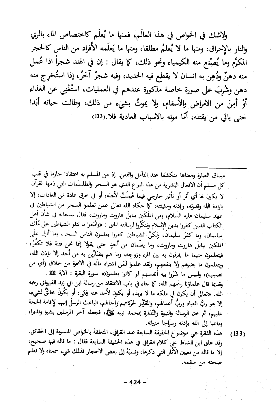 (١٣٣) هذه الفقرة هي موضوع الحقيقة السابعة عند القرافي، المتعلقة بالخواص المنسولة إلى الحقائق. وقد علق ابن الشاط على كلام القرافي في هذه الحقيقة السابعة فقال: ما قاله فيها صحيح، إلا ما قاله من تعيين الآثار التي ذكرها، ونسبَهُ إلى بعض الاحجار فذلك شيء سمعناه ولا نعلم صحته من سقمه.