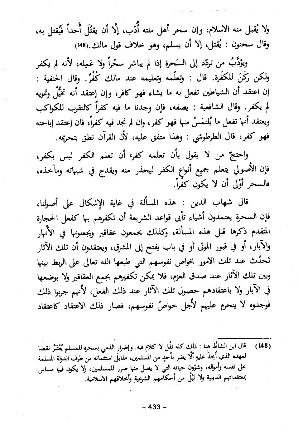 (١٤٨) قال ابن الشاط هنا: ذلك كله نقْل لا كلام فيه. وإضرارْ الذمي بسحره للمسلم يُعْتبَرُ نقضا لعهده الذي أُخذَ عليهِ ألا يضر بأحدٍ من المسلمين، مقابلَ استئمانه من طرف الدولة المسلمة على نفسه وأمواله، وشؤون حياته التي لا يصل منها ضرر للمسلمين، ولا يكون فيها مساس بمعتقداتهم الدينية ولا نيْلٌ من أحكامهم الشرعية وأخلاقهم الاسلامية.