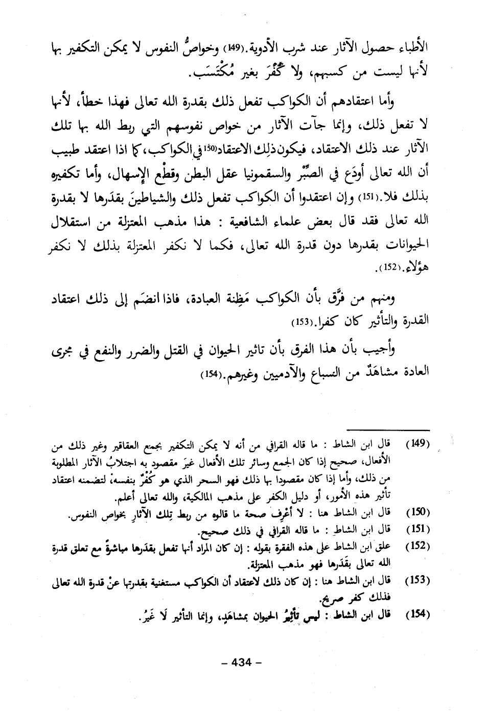 وأما اعتقادهم أن الكواكب تفعل ذلك بقدرة الله تعالى فهذا خطأ، لأنها لا تفعل ذلك، وإنما جآت الآثار من خواص نفوسهم التي ربط الله بها تلك الآثار عند ذلك الاعتقاد، فيكون ذلِك الاعتقاد (١٥٠) في الكواكب، كما إذا اعتقد طبيب أن الله تعالى أودَع في الصِّبْر والسقمونيا عقل البطن وقطْع الإِسهال، وأما تكفيره بذلك فلا. (١٥١) وإن اعتقدوا أن الكواكب تفعل ذلك والشياطينَ بقدَرها لا بقدرة الله تعالى فقد قال بعض علماء الشافعية: هذا مذهب المعتزلة من استقلال الحيوانات بقدرها دون قدرة. الله تعالى، فكما لا نكفر المعتزلة بذلك لا نكفر هؤلاء. (١٥٢).