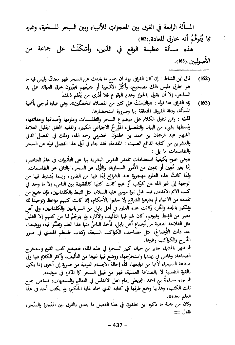 (١٦٢) قال ابن الشاط: إن كان القرافي يريد أن جميع ما يحدث عن السحر فهو معتادٌ ولس فيه ما هو خارق فليس ذلك بصحيح، وأكثرُ الاشعرية أو جميعُهم يجوزون خرق العوائد على يد الساحر، الا أن يقول بالجواز وعدم الوقوع فلا أدرى من يَعْلم ذلك.