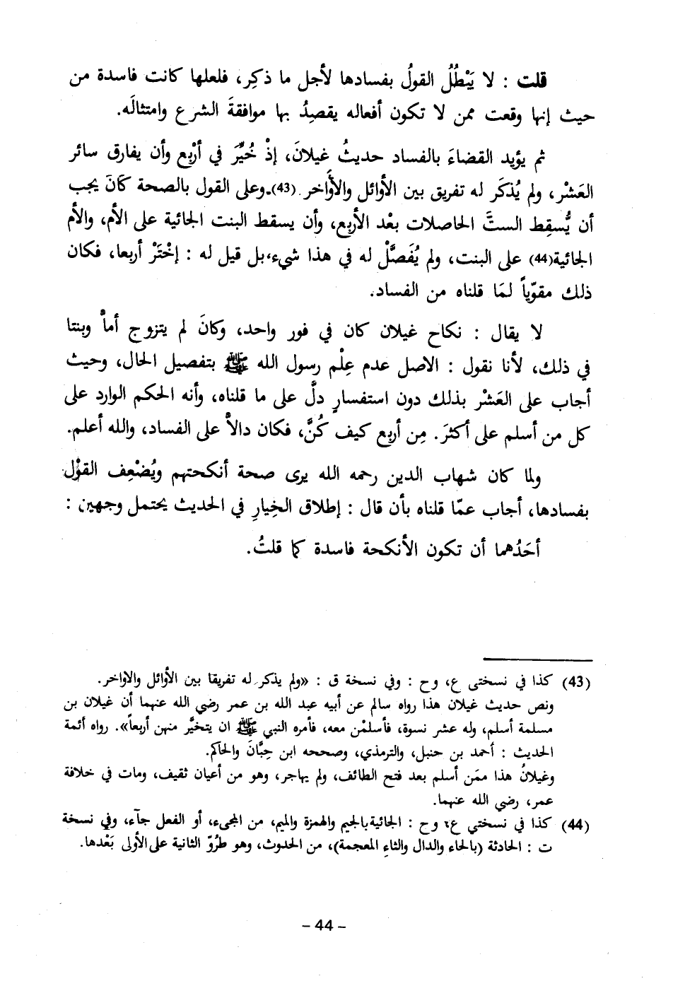 ثم يؤيد القضاءَ بالفساد حديثُ غيلانَ، اذْ خُيِّرَ في أرْبع وأن يفارق سائر العَشْر، ولم يُذكَر له تفريق بين الأوائل والأوَاخر (٤٣) - وعلى القول بالصحة كانَ يجب أن يُّسقِط الستّ الحاصلات بعْد الأربع، وأن يسقط البنت الجائية على الأم، والأم الجائية (٤٤) على البنت، ولم يُفَصَّلْ له في هذا شيء، بل قيل له: إخْتَرْ أربعا، فكان ذلك مقوّيًا لمَا قلناه من الفساد.