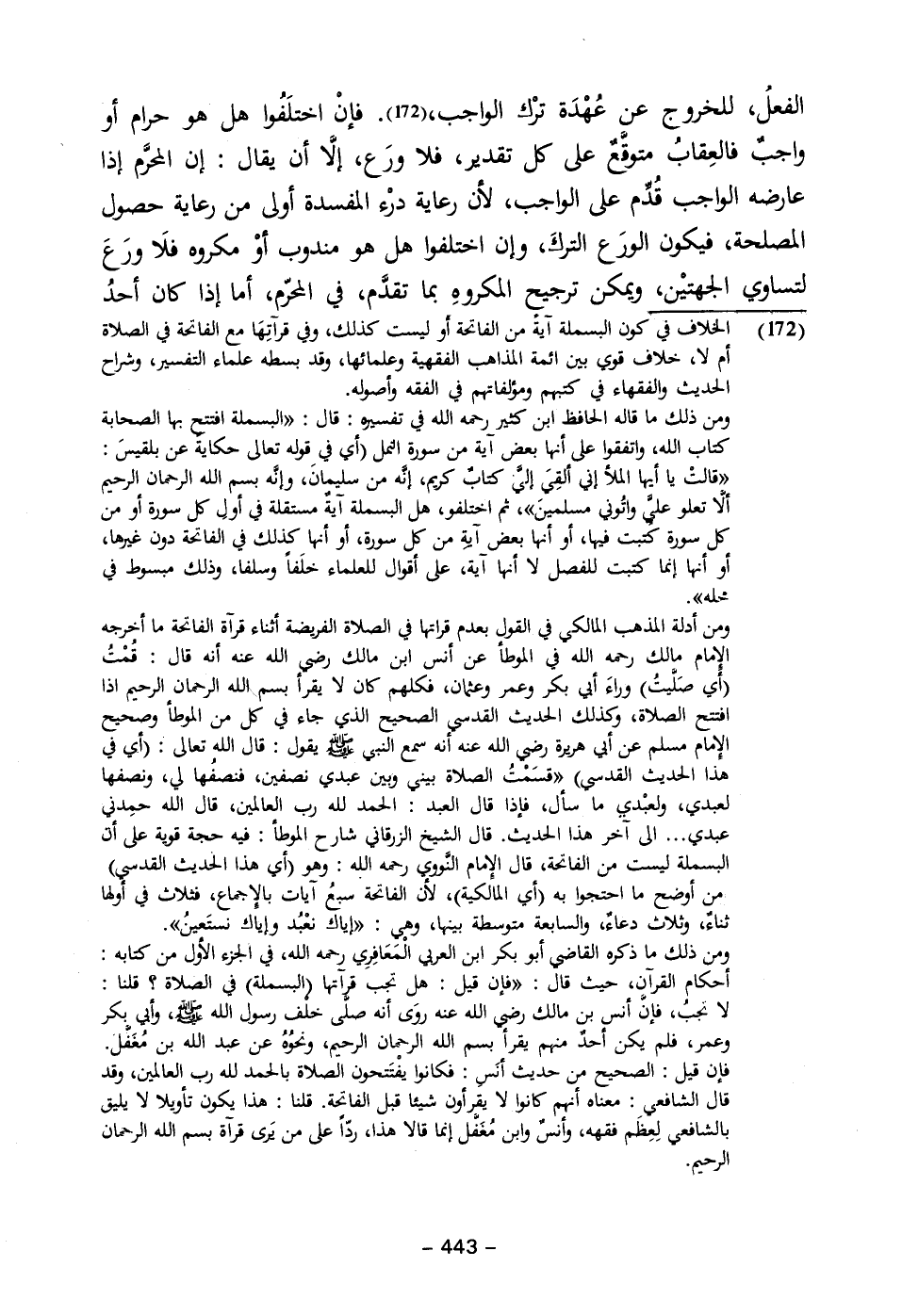 (١٧٢) الخلاف في كون البسملة آية من الفاتحة أو ليست كذلك، وفي قرآتِهَا مع الفاتحة في الصلاة أم لا، خلاف قوى بين ائمة المذاهب الفقهية وعلمائها، وقد بسطه علماء التفسير، وشراح الحديث والفقهاء في محيبهم ومؤلفاتهم في الفقه وأصوله.