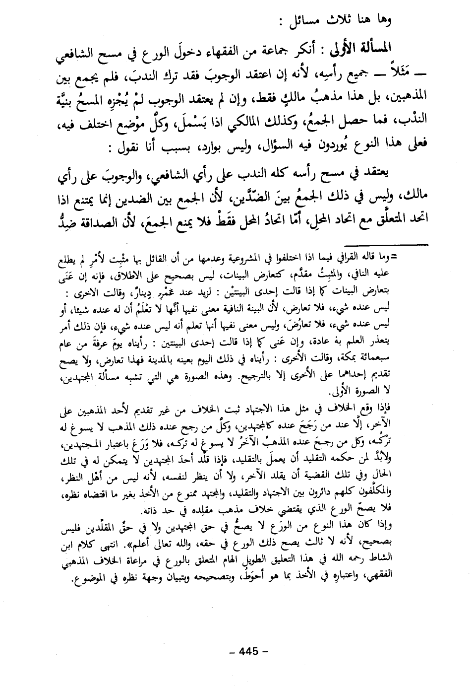 المسألة الأولى: أنكر جماعة من الفقهاء دخولَ الورع في مسح الشافعي - مَثَلاً- جميع رأسِه، لأنه ان اعتقد الوجوبَ فقد ترك الندبَ، فلم يجمع بين المذهبين، بل هذا مذهبُ مالكٍ فقط، وإن لم يعتقد الوجوب لمْ يُجْزِه المسحُ بنيَّة الندْب، فما حصل الجمعُ، وكذلك المالكي إذا بَسْملَ، وكلُّ موْضع اختلف فيه، فعلى هذا النوع يُوردون فيه السؤال، وليس بوارد، بسبب أنا نقول: