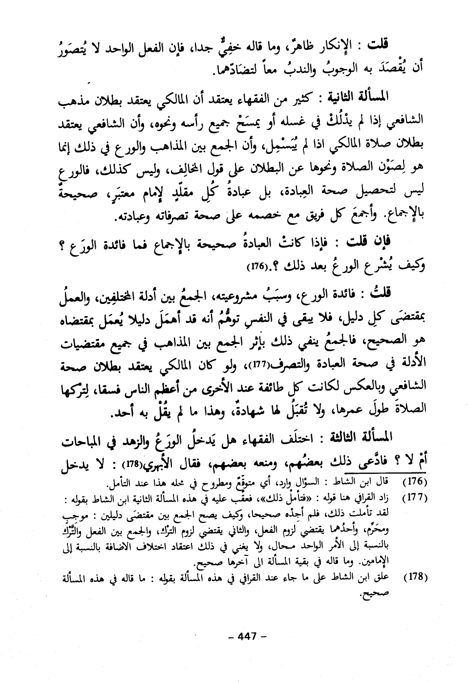 قلتُ: فائدة الورع، وسبَبُ مشروعيته، الجمعُ بين أدلة الختلفِين، والعملُ بمقتضَى كلِ دليل، فلا يبقى في النفس توهُّمُ أنه قد أهمَلَ دليلا يُعمَل بمقتضاه هو الصحيح، فالجمعُ ينفي ذلك بأبر الجى بين المذاهب في جميع مقتضيات الأدلة في صحة العبادة والتصرف (١٧٧)، ولو كان المالكي يعتقد بطلان صحة الشافعي وبالعكس لكانت كل طائفة عند الأخرى من أعظم الناس فسقا، لِترْكها الصلاةَ طولَ عمرها، ولا تُقبَلُ لها شهادةٌ، وهذا ما لم يقُلْ به أحد.