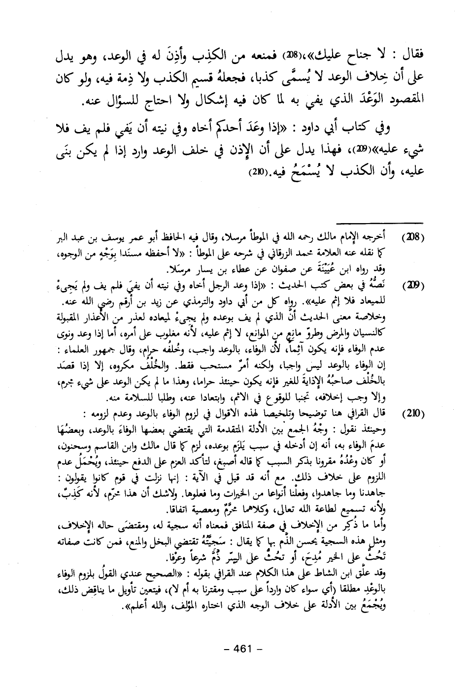 (٢١٠) قال القرافي هنا توضيحا وتلخيصا لهذه الاقوال في لزوم الوفاء بالوعد وعدم لزومه: