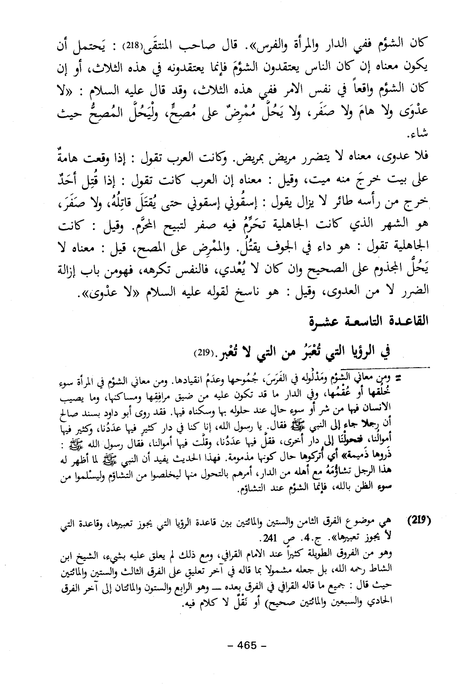 (٢١٩) هي موضوع الفرق الثامن والستين والمائتين بين قاعدة الرؤيا التي يجوز تعبيرها، وقاعدة التي لا يجوز تعبيرها". جـ ٤. ص ٢١٧.