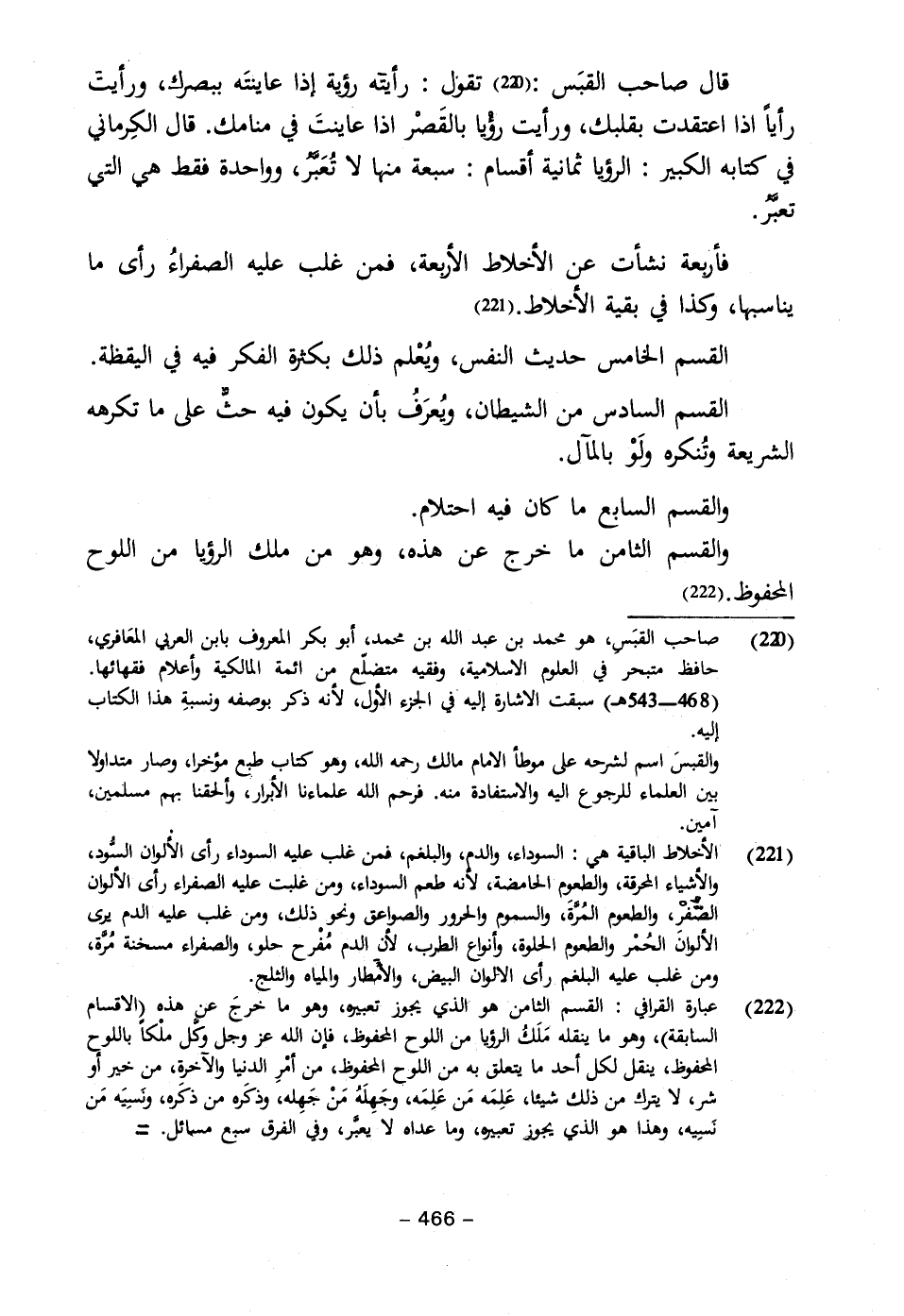 (٢٢٢) عبارة القرافي: القسم الثامن هو الذي يجوز تعبيره، وهو ما خرجَ عني هذه (الاقسام السابقة)، وهو ما ينقله مَلَكُ الرؤيا من اللوح المحفوظ، فإن الله عز وجل وكل ملْكاً باللوح المحفوظ، ينقل لكل أحد ما يتعلق به من اللوح المحفوظ، من أمْرِ الدنيا والآخرة، من خير أو شر، لا شرك من ذلك شيئا، عَلِمَه مَن عَلِمَه، وجَهِلَهُ مَنْ جَهِله، وذكَره من ذكَره، ونَسِيَه مَن نَسِيه، وهذا هو الذي يجوز تعبيره، وما عداه لا يعبَّر، وفي الفرق سبع مسائل. =
