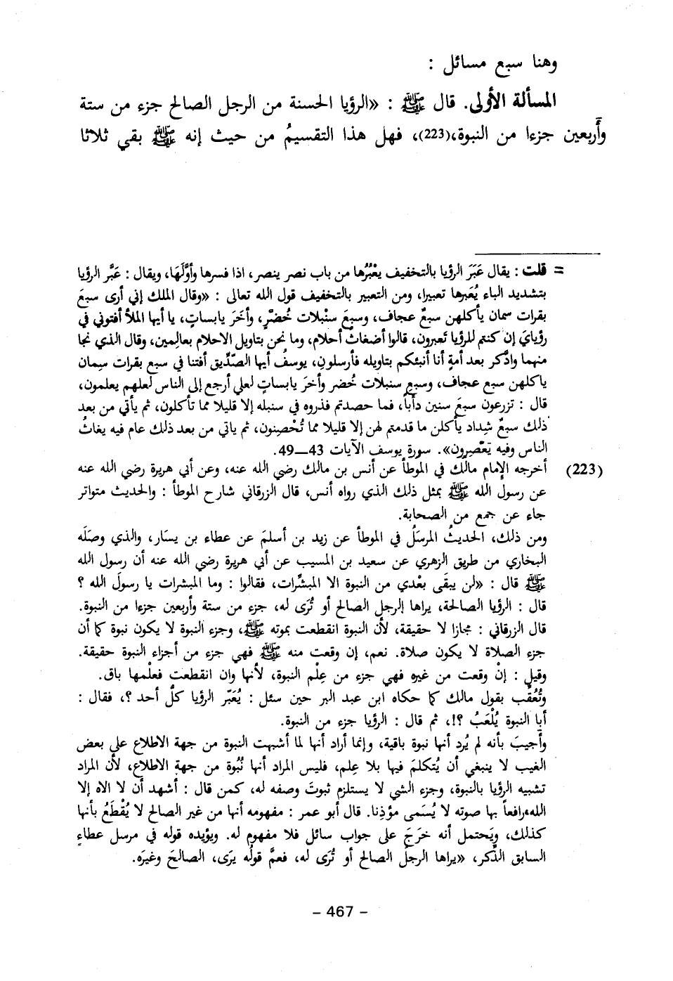 المسألة الأولى. قال - صلى الله عليه وسلم -: "الرؤيا الحسنة من الرجل الصالح جزء من ستة وأربعين جزءا من النبوة، (٢٢٣)، فهل هذا التقسيمُ من حيث إنه - صلى الله عليه وسلم - بقي ثلاثا