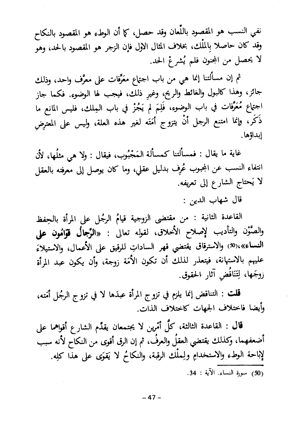 القاعدة الثانية: من مقتضى الزوجية قيامُ الرجُل على المرأة بالحِفظ والصَّوْن والتأديب لإصلاح الأخلاق، لقوله تعالى: {الرِّجَالُ قَوَّامُونَ عَلَى النِّسَاءِ} " (٥٠) والاسترقاق يقتضي قهر الساداتِ للرقيق على الأعمال، والاستيلاءَ عليهم بالاستهانة، فيتعذر لذلك أن تكون الأمَة زوجة، وأن يكون عبد المرأة زوجَها، لِتَنَاقُضِ آثار الحقوق.