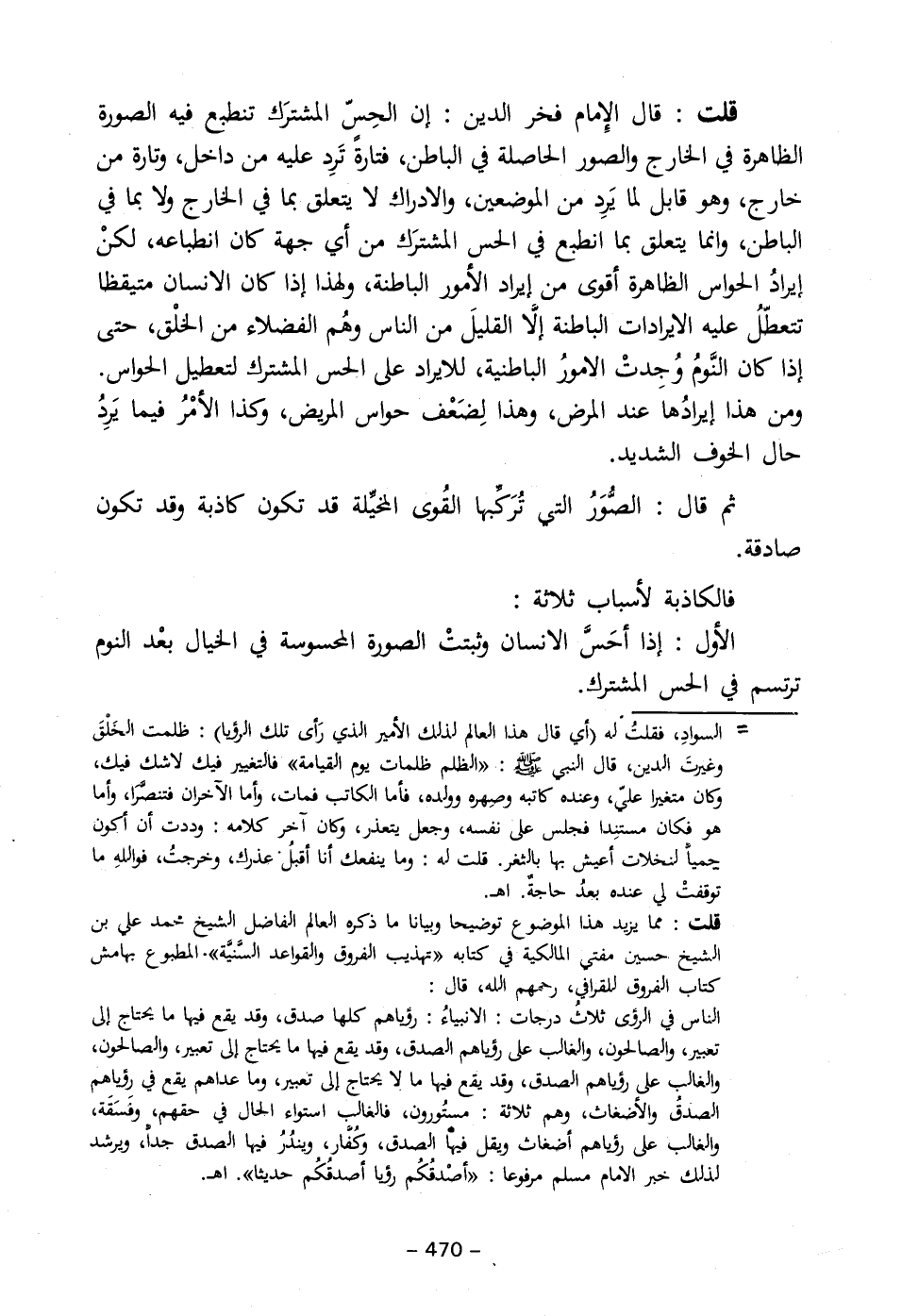 قلت: قال الإِمام فخر الدين: إن الحِسّ المشترَك تنطبع فيه الصورة الظاهرة في الخارج والصور الحاصلة في الباطن، فتارةً تَرِد عليه من داخل، وتارة من خارج، وهو قابل لما يَرِد من الموضعين، والادراك لا يتعلق بما في الخارج ولا بما في الباطن، وانما يتعلق بما انطبع في الحس المشترَك من أي جهة كان انطباعه، لكنْ إيرادُ الحواس الظاهرة أقوى من إيراد الأمور الباطنة، ولهذا إذا كان الانسان متيقظا تتعطّلُ عليه الايرادات الباطنة إلا القليلَ من الناس وهُم الفضلاء من الخلْق، حتى إذا كان النَّومُ وُجِدتْ الامورُ الباطنية، للايراد على الحس المشترك لتعطيل الحواس. ومن هذا إيرادُها عند المرض، وهذا لِضَعْف حواس المريض، وكذا الأمْرُ فيما يَرِدُ حال الخوف الشديد.
