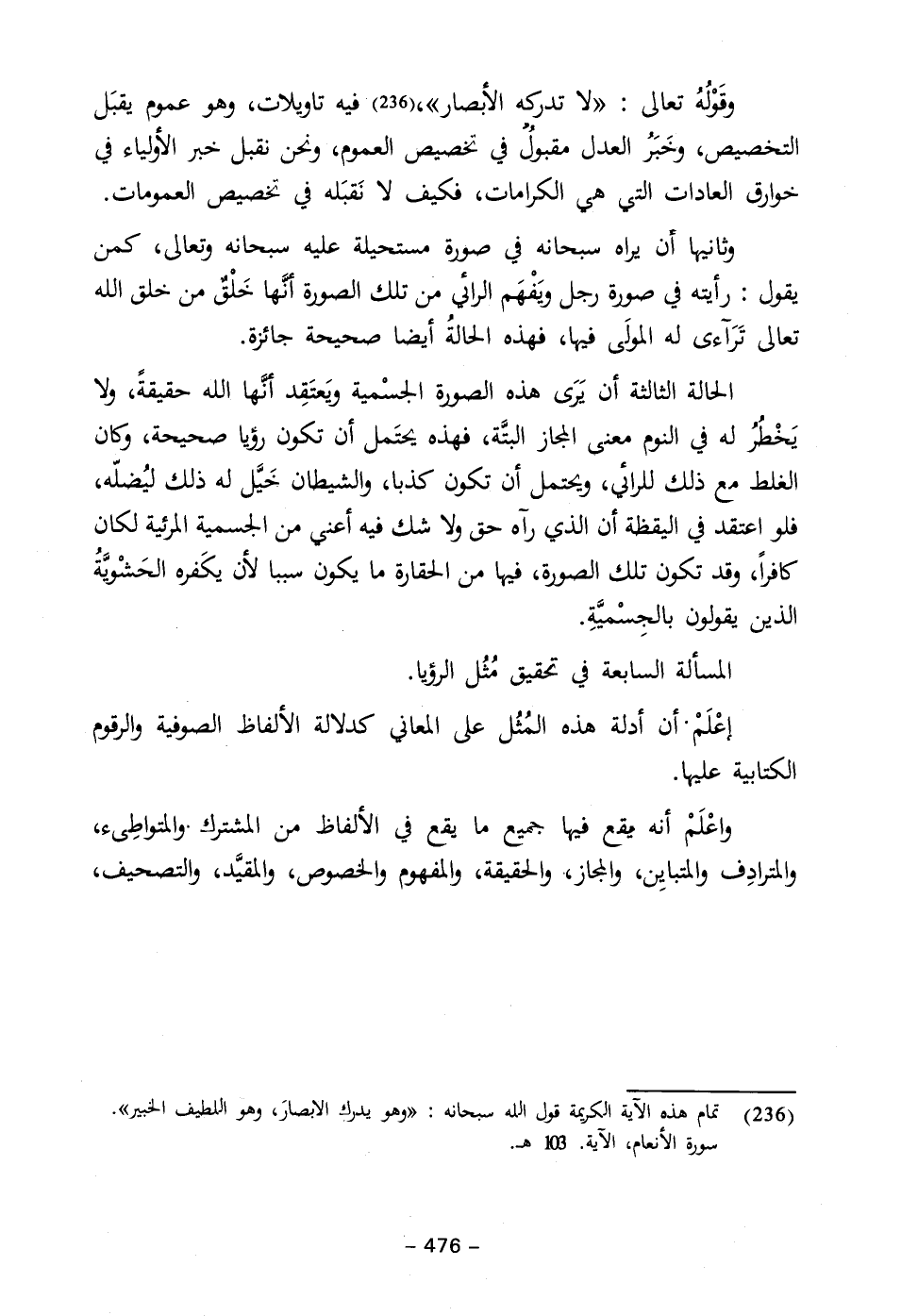 وقَوْلُهُ تعالى: {لَا تُدْرِكُهُ الْأَبْصَارُ}، (٢٣٦) فيه تاويلات، وهو عموم يقبَل التخصيص، وخَبَرُ العدل مقبول في تخصيص العموم، ونحن نقبل خبر الأولياء في خوارق العادات التي هي الكرامات، فكيف لا نَقبَله في تخصيص العمومات.