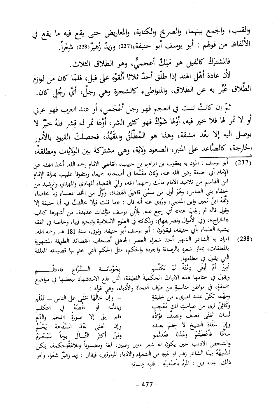 (٢٣٧) أبو يوسف: المراد به يعقوب بن ابراهيم بن حبيب، القاضي الامام رحمه الله. أخذ الفقه عن الإمام أبي حنيفة رضي الله عنه، وكان مقَدَّما في أصحابه. صحيحا، ومتفوقا عليهم، بمنزلة الإِمام ابن القاسم من تلاميذ الامام مالك رحمهما الله، ولِيَ القضاء للهادي والمهدِي والرشيد من خِلفاء بئ الباس، وهُوَ أول من سمِّيَ قاضيَ القضاة، وأوَّلُ من اتخذ العلماء زيًّا خاصا، وثّقَهُ ابنُ مَعين وابن المديني، ورُوي عنه أنه قال: "ما قلت قولا خالفتُ فيه أبا حنيفة إلا وقول قاله ثم رغِبَ عنه" أي رجع عنه. ولأبي يوسف مؤلفات عديدة، من أشهرها كتاب "الخراج"، (في الأموال وتصريفها)، ولمكانته في العلوم الاسلامية وتبحره فيها، وخاصة في الفقه يشبهه العلماء بأبي حنيفة، فيقولون: أبو يوسف أبو حنيفة. وتوفي، سنة ١٨١ هـ. رحمه الله.