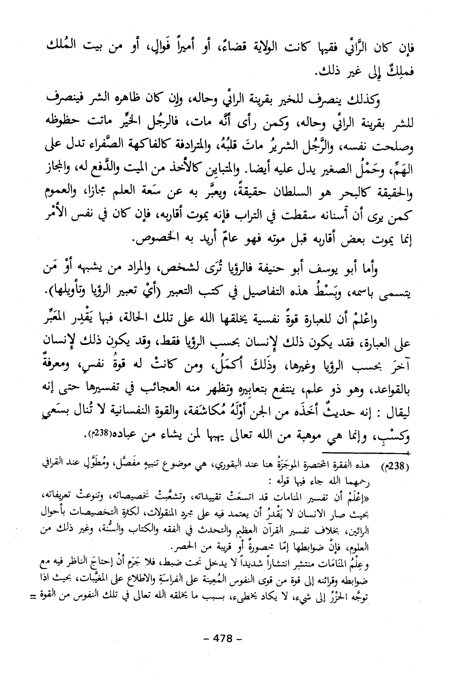 واعْلمْ أن للعبارة قوةً نفسية يخلقها الله على تلك الحالة، فبها يَقْدِر المعَبِّر على العبارة، فقد يكون ذلك لإِنسان بحسب الرؤيا فقط، وقد يكون ذلك لإِنسان آخرَ بحسب الرؤيا وغيرها، وذَلكَ أكمَلُ، ومن كانتْ له قوةُ نفسِ، ومعرفةٌ بالقواعد، وهو ذو علم، ينتفع بتعابِيره وتظهر منه العجائب في تفسيرها حتى إنه ليقال: إنه حديثٌ أخَذَه من الجن أوْلَهُ مُكاشَفة، والقوة النفسانية لا تُنال بسَعى كسْبٍ، وإنما هي موهبة من الله تعالى يهبها لمن يشاء من عباده (٢٣٨ م).