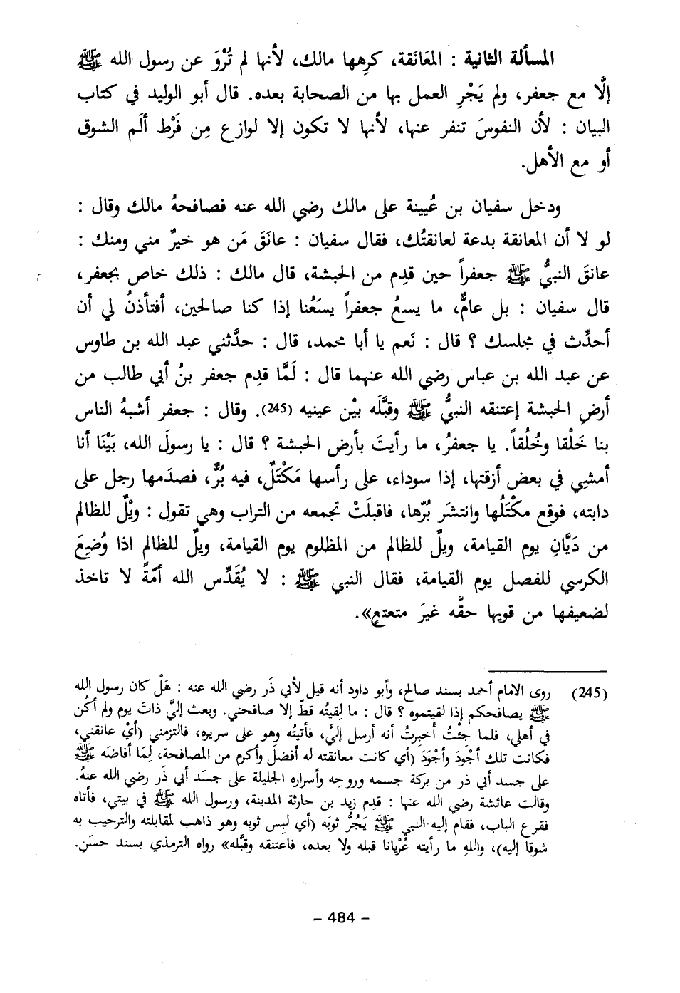 ودخل سفيان بن عُيينة على مالك رضي الله عنه فصافحهُ مالك وقال: لولا أن المعانقة بدعة لعانقتُك، فقال سفيان: عانَقَ مَن هو خيرٌ مني ومنك: عانقَ النبيُّ - صلى الله عليه وسلم - جعفراً حين قدِم من الحبشة، قال مالك: ذلك خاص بجعفر، قال سفيان: بل عامٌّ، ما يسعُ جعفراً يسَعُنا إذا كنا صالحين، أفتأذنُ لي أن أحدِّث في مجلسك؟ قال: نَعم يا أبا محمد، قال: حدَّثني عبد الله بن طاوس عن عبد الله بن عباس رضي الله عنهما قال: لَمَّا قدِم جعفر بنُ أبي طالب من أرض الحبشة إعتنقه النبيُّ - صلى الله عليه وسلم - وقبَّلَه بيْن عينيه (٢٤٥). وقال: جعفر أشبهُ الناس بنا خَلْقا وخُلُقاً. يا جعفرُ، ما رأيتَ بأرض الحبشة؟ قال: يا رسولَ الله، بَيْنَا أنا أمشِي في بعض أزقتها، إذا سوداء، على رأسها مَكْتَل، فيه بُرٌّ، فصدَمها رجل على دابته، فوخ مكْتَلُها وانتشَر بُرّها، فاقبلَتْ تجمعه من التراب وهي تقول: ويْلٌ للظالم من دَيَّانِ يوم القيامة، ويلٌ للظالم من المظلوم يوم القيامة، ويل للظالم إذا وُضِعَ الكرسي للفصل يوم القيامة، فقال النبي - صلى الله عليه وسلم -: لا يُقَدِّس الله أمّة لا تاخذ لضعيفها من قويهاحقَّه غيرَ متعتعٍ".