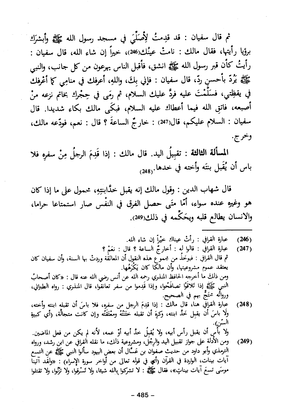 (٢٤٩) ومن الأدلة على جواز تقبيل اليد والرِجْل، ومشروعية ذلك، ما نقله القرافي عن ابن رشد، ورواه الترمذي وأبو داود من حديث صفوان بن عَسَّال أن بعض اليهود سألوا النبي - صلى الله عليه وسلم - عن التسع آيات بينات، الواردة في القران (أي في قوله تعالى من أواخر سورة الإسراء): {وَلَقَدْ آتَيْنَا مُوسَى تِسْعَ آيَاتٍ بَيِّنَاتٍ}، فقال - صلى الله عليه وسلم -: لا تتركوا بالله شيئا، ولا تَسْرقوا، ولا تزْنُوا، ولا تقتلوا