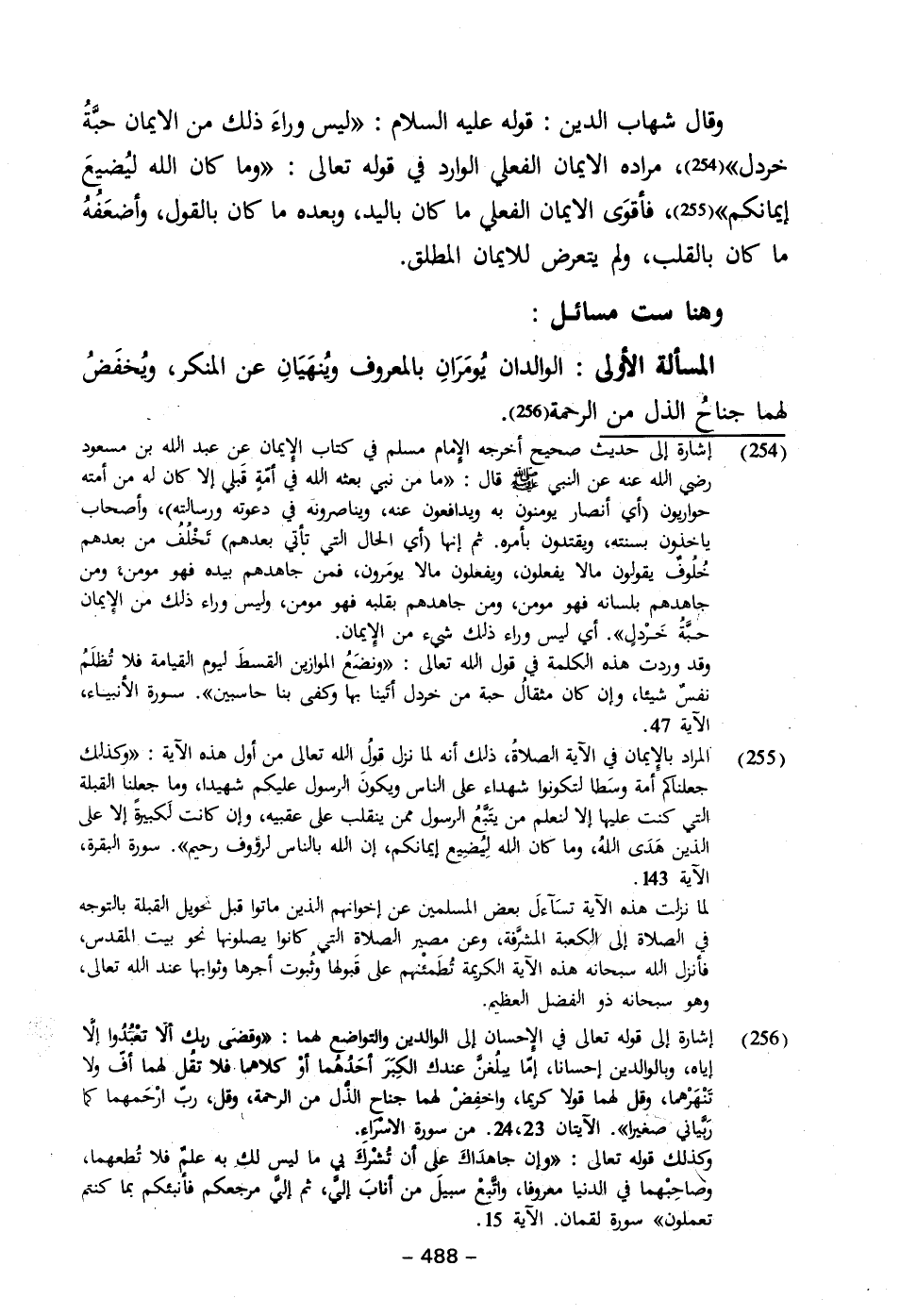 وقال شهاب الدين: قوله عليه السلام: "ليس وراءَ ذلك من الايمان حبَّةُ خردل" (٢٥٤)، مراده الايمان الفعلي الوارد في قوله تعالى: {وَمَا كَانَ اللَّهُ لِيُضِيعَ إِيمَانَكُمْ} (٢٥٥)، فأقوَى الايمان الفعلي ما كان باليد، وبعده ما كان بالقول، وأضعَفُهُ ما كان بالقلب، ولم يتعرض للايمان المطلق.