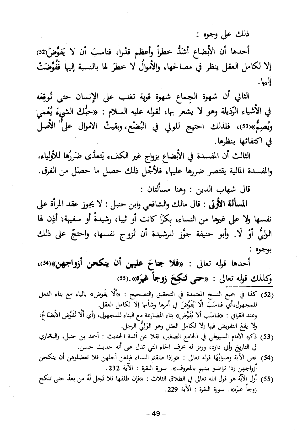 (٥٢) كذا في جميع النسخ المعتمدة في التحقيق والتصحيح: "ألَّا يفَوض" بالياء ح بناء الفعل للمجهول، أي فناسَبَ ألَّا يُفَوضَ في أمرها وشأنها إلا لكامل العقل.
