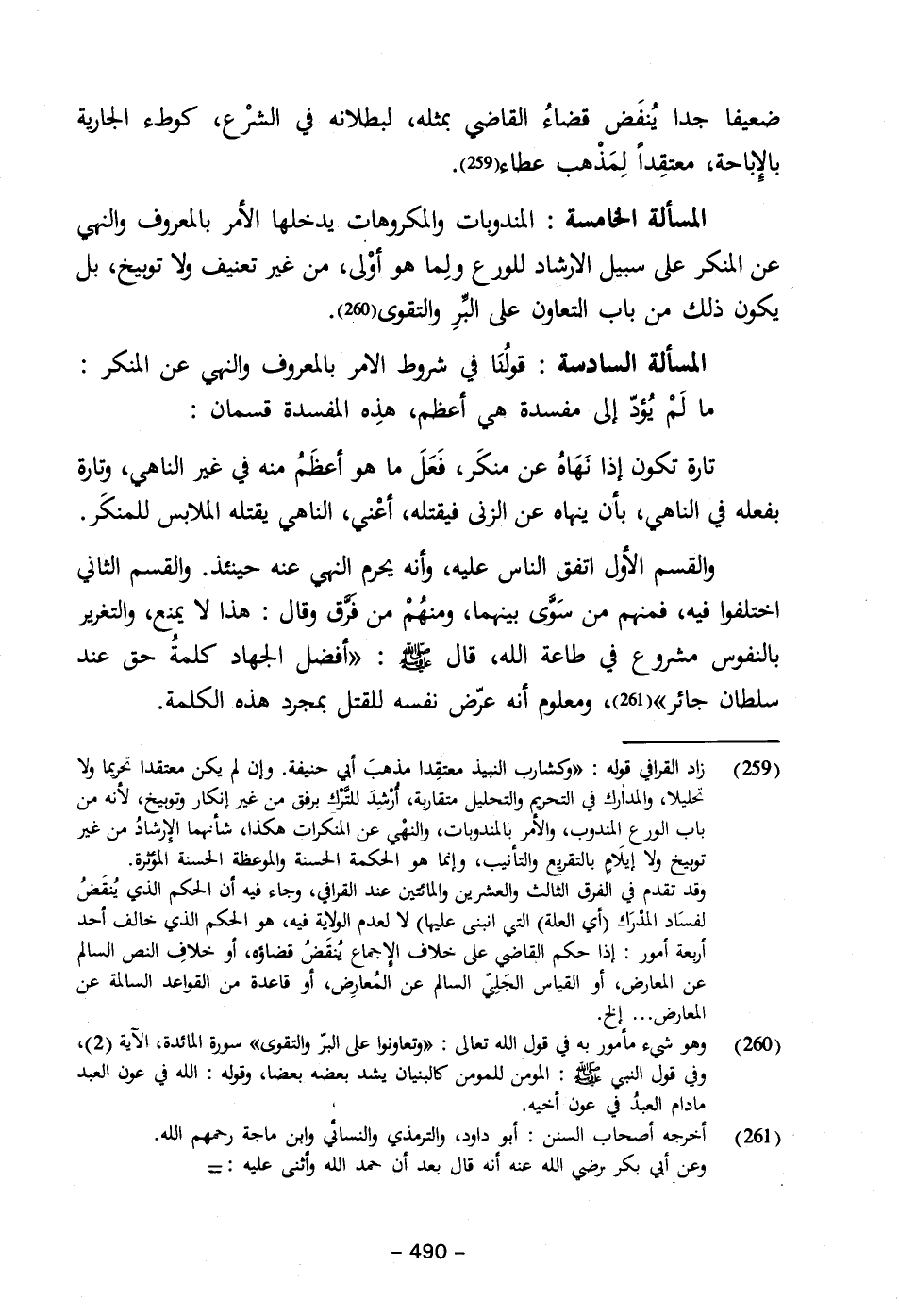 المسألة الخامسة: المندوبات والمكروهات يدخلها الأمر بالمعروف والنهي عن المنكر على سبيل الارشاد للورع ولِما هو أوْلى، من غير تعنيف ولا توبيخ، بل يكون ذلك من باب التعاون على البِّرِ والتقوى (٢٦٠).