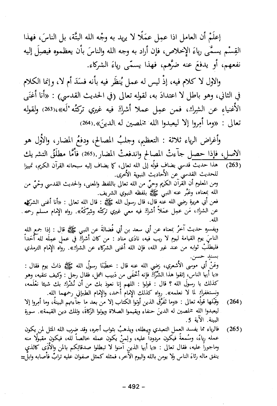 فعن أبي هريرة رضي الله عنه قال، قال رسول الله - صلى الله عليه وسلم -: قال الله تعالى: "أنا أغنى الشركاء عن الشرك، مَن عمِل عمَلاً أشركَ فيه معي غيري تركتُه وشِركَهُ". رواه الإِمام مسلم رحمه الله.