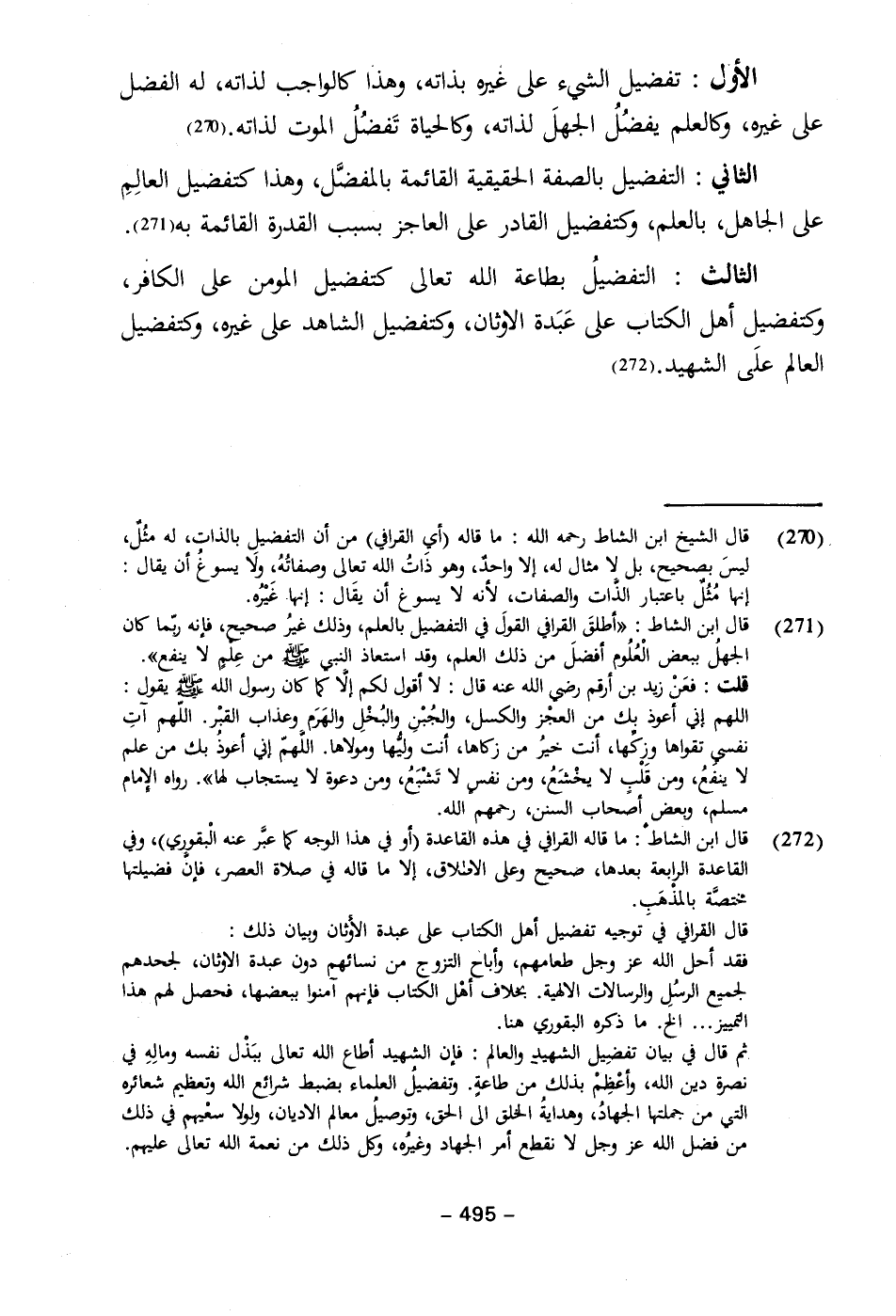 (٢٧٠) قال الشيخ ابن الشاط رحمه الله: ما قاله (أي القرافي) من أن التفضيل بالذات، له مثُلٌ، ليسَ بصحيح، بل لا مثال له، إلا واحدٌ، وهو ذاتُ الله تعالى وصفاتُهُ، ولَا يسوغُ أن يقال: إنها مُثُل باعتبار الذَّات والصفات، لأنه لا يسوغ أن يقَال: إنها غَيْرُه.